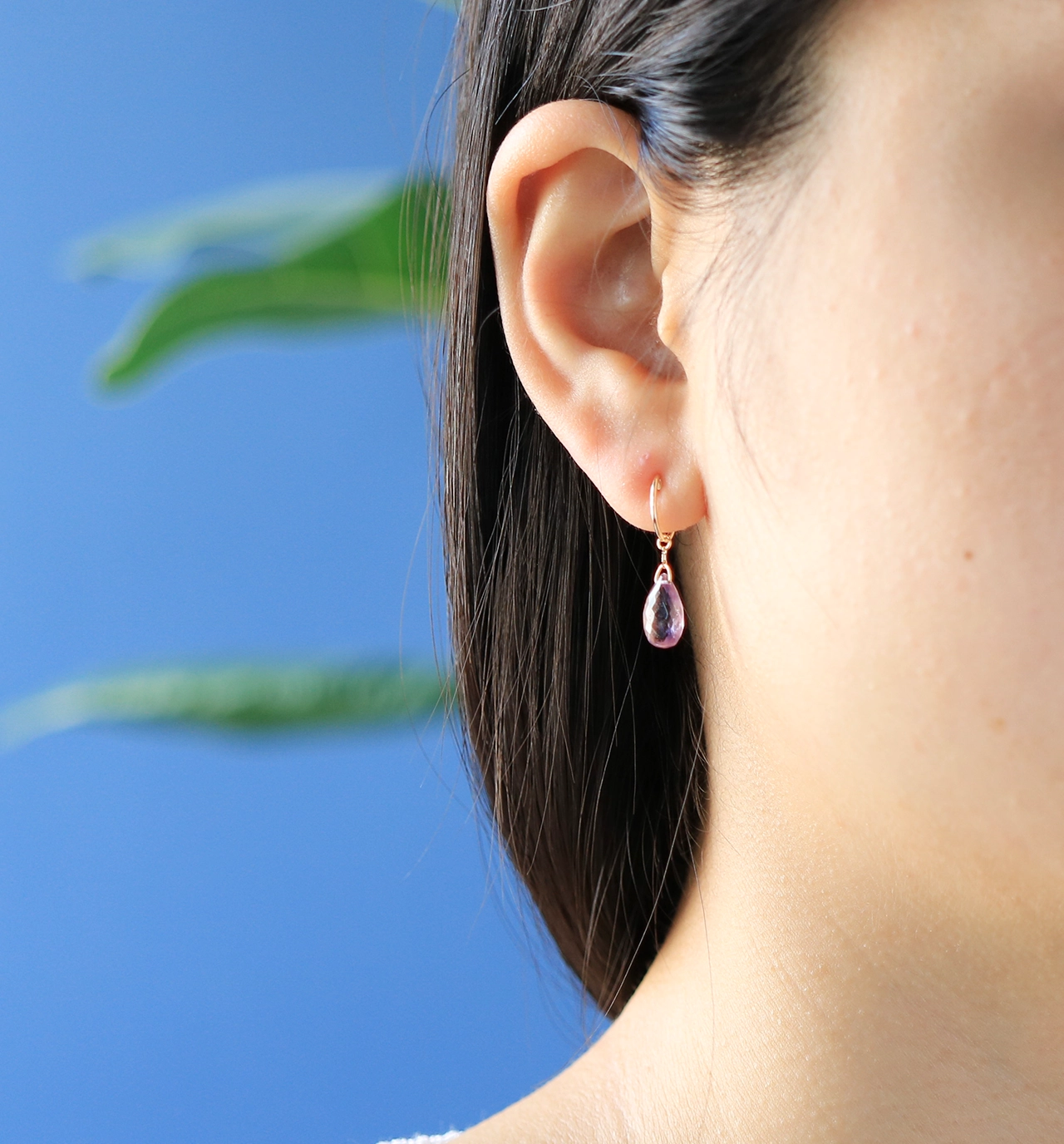 イヤリングと石のつなぎには極細な10金チェーンを使用し、石の魅力が最大限に引き立つようにしました。