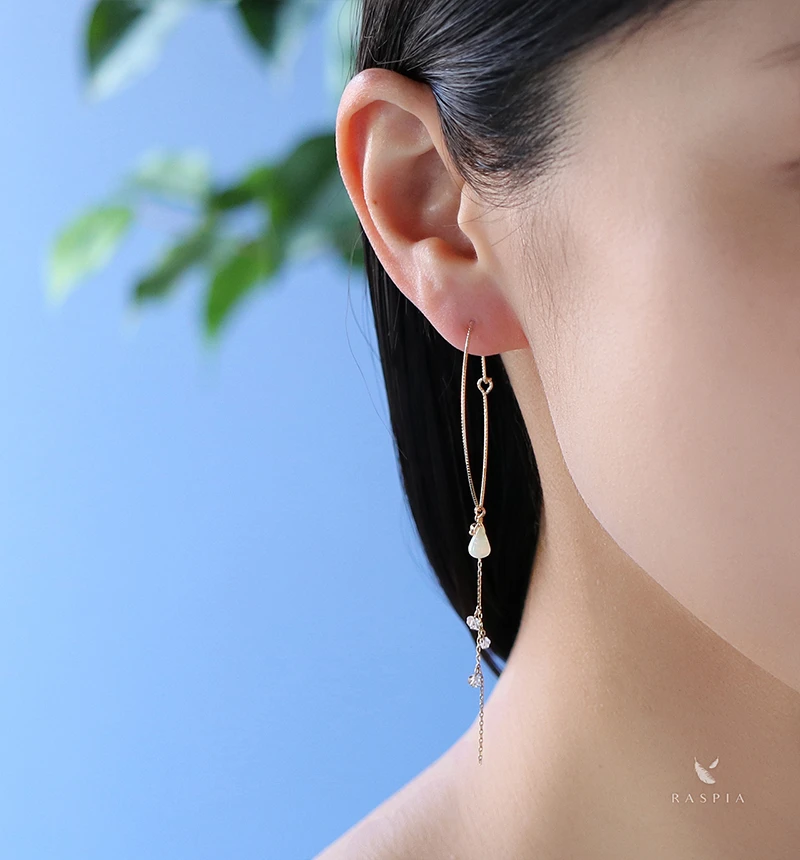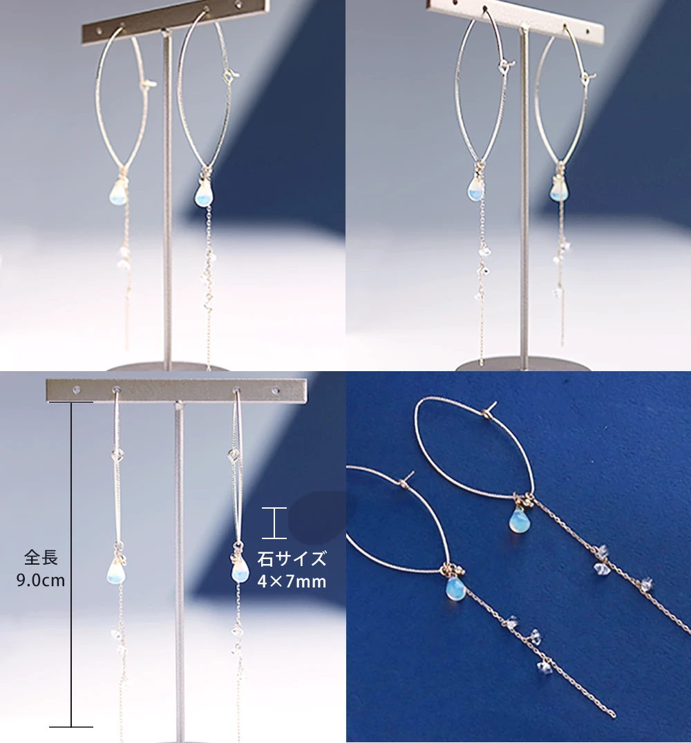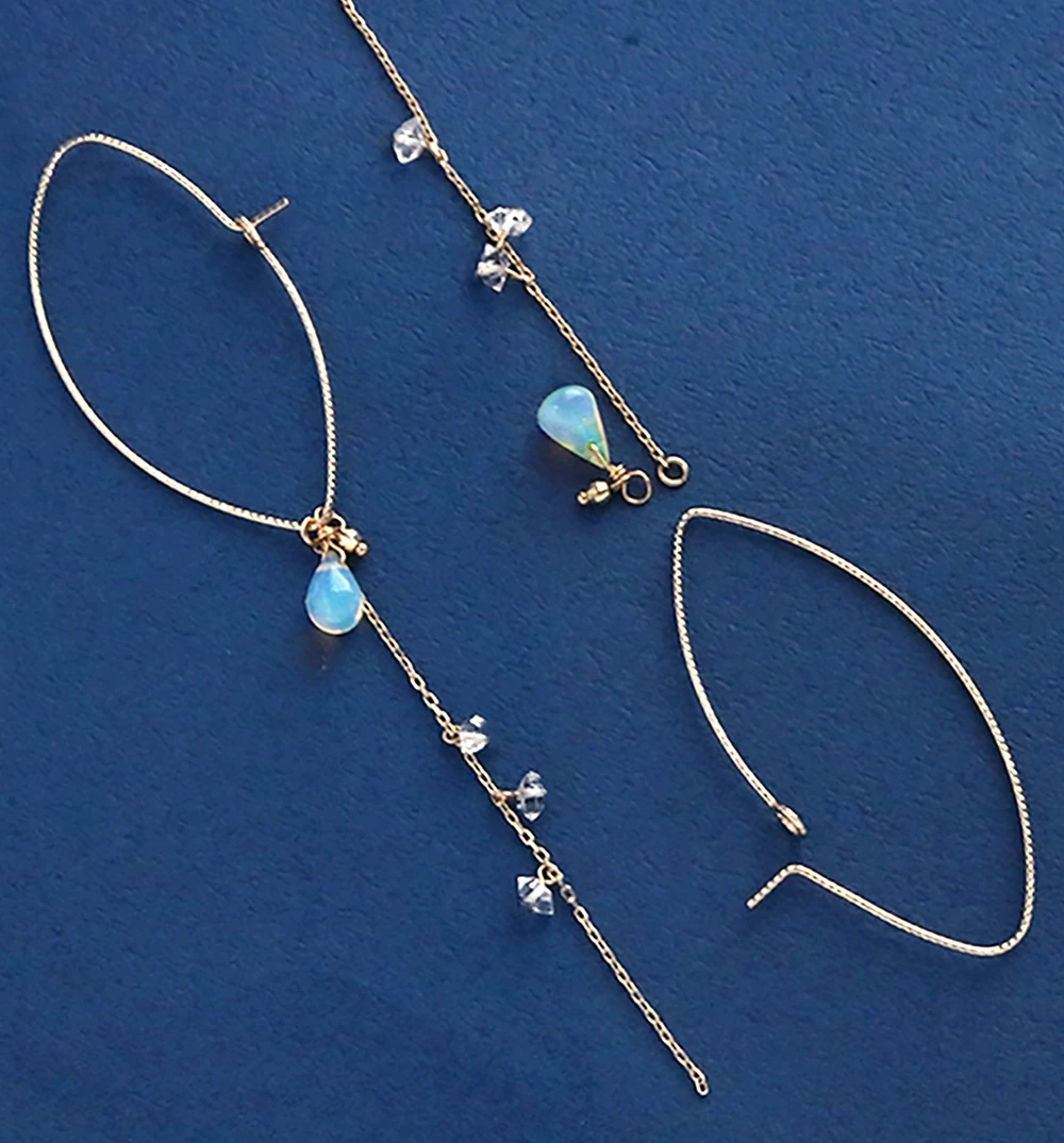 オパールのピュアな色合いを引き立たせるために金属部分は全てK10を使用しています。 キラキラのフープはマーキスシェイプに仕上げてあり、流れるような一体感と美しさを感じさせます。 オパール、チェーンそれぞれチャーム単独で取り外し可能ですので、気分に合わせて組み合わせをお楽しみ頂けます。