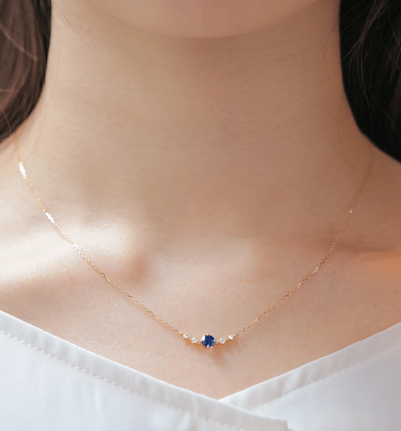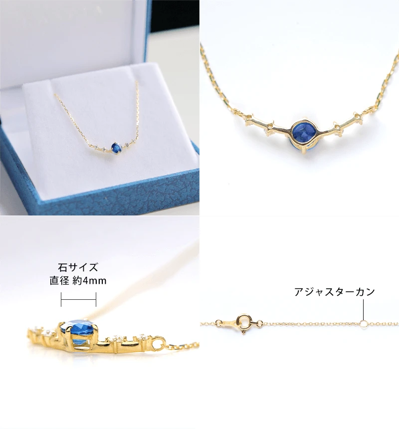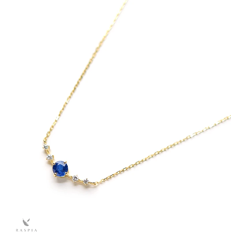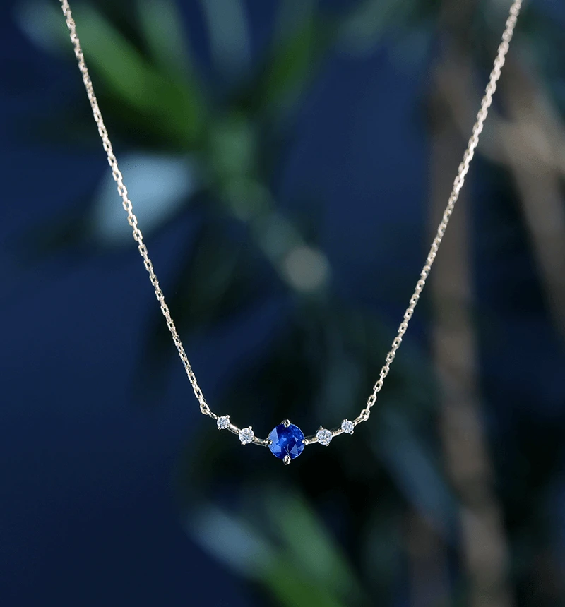 マダガスカル産のブルーカラーが美しいサファイアのラウンドカットをメインに、4つのメレダイヤを配したK18ネックレスです。 3大宝石の一つとして、有名なサファイア。澄み切ったブルーは美しく人々を魅了してきた宝石です。