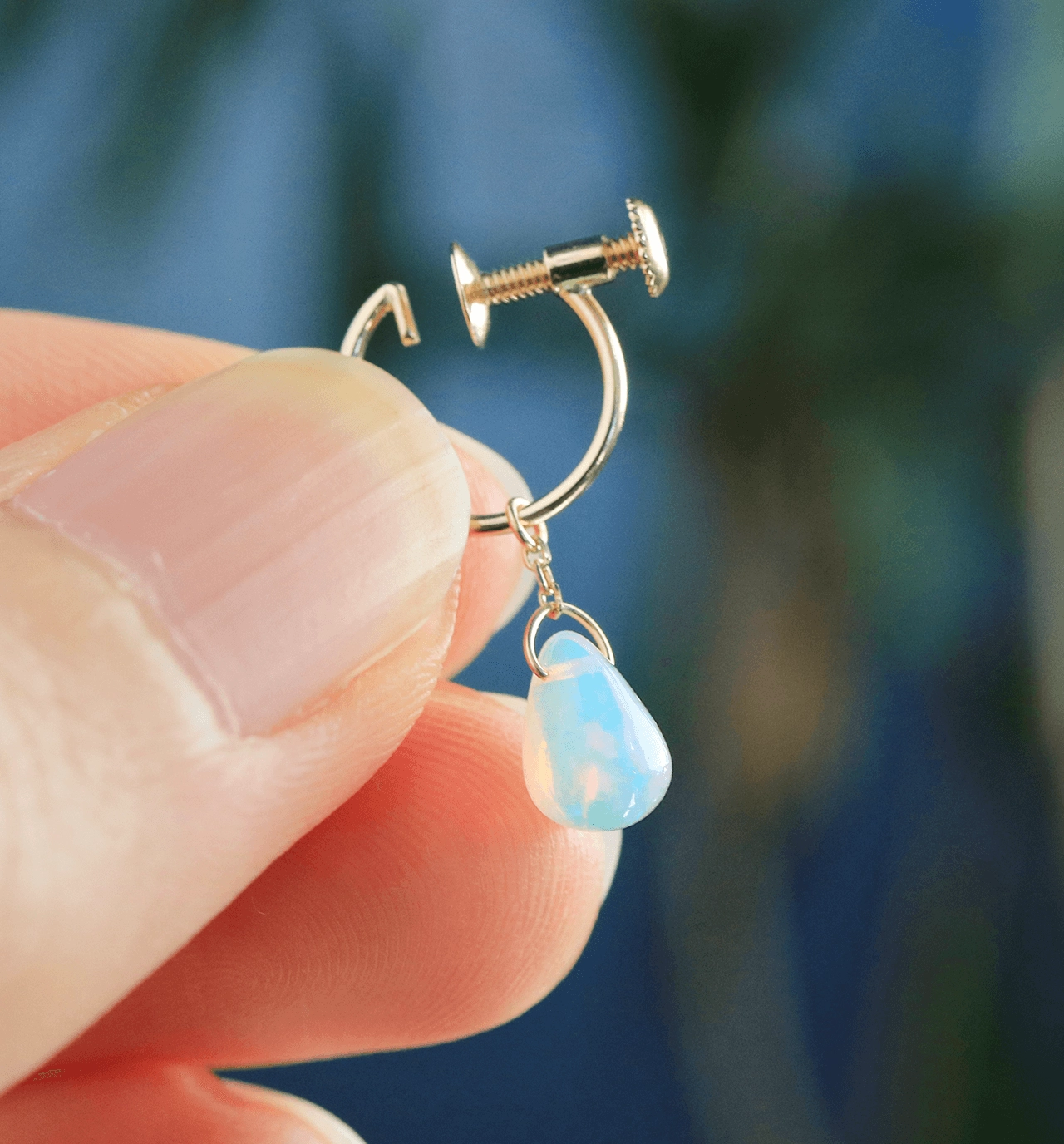 つるんとした透き通るホワイトに色とりどりの光を見せるオパールを使用したイヤリング。