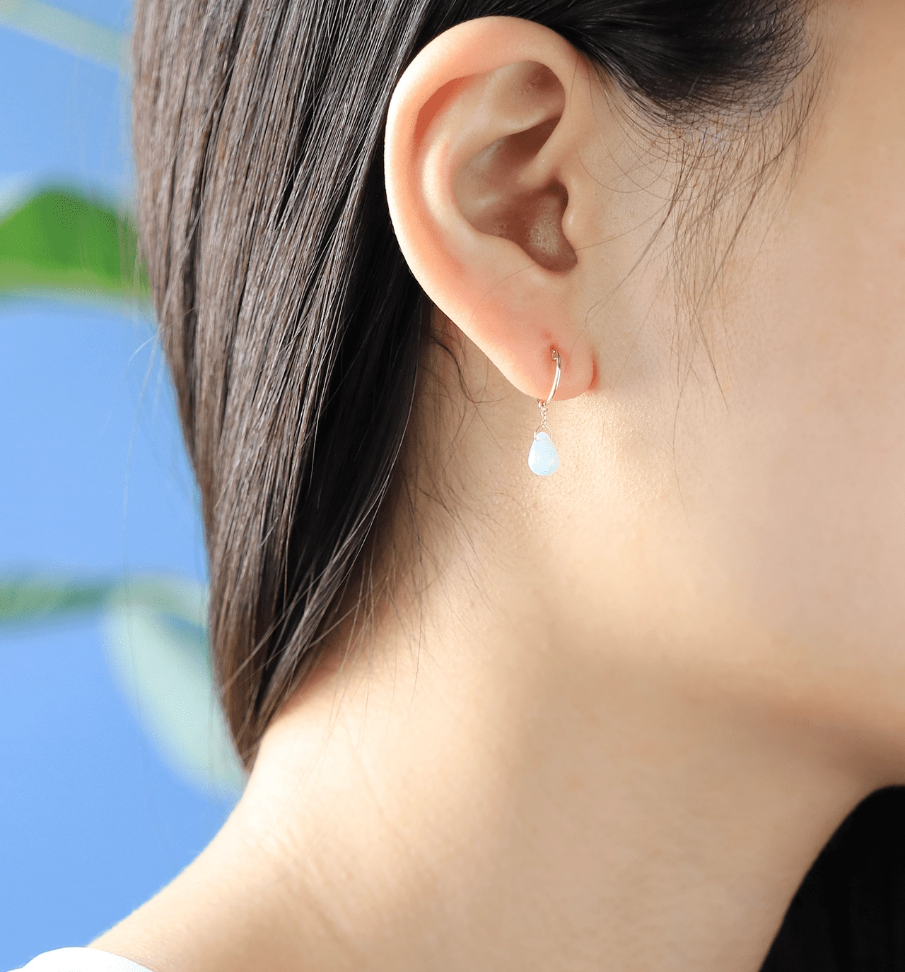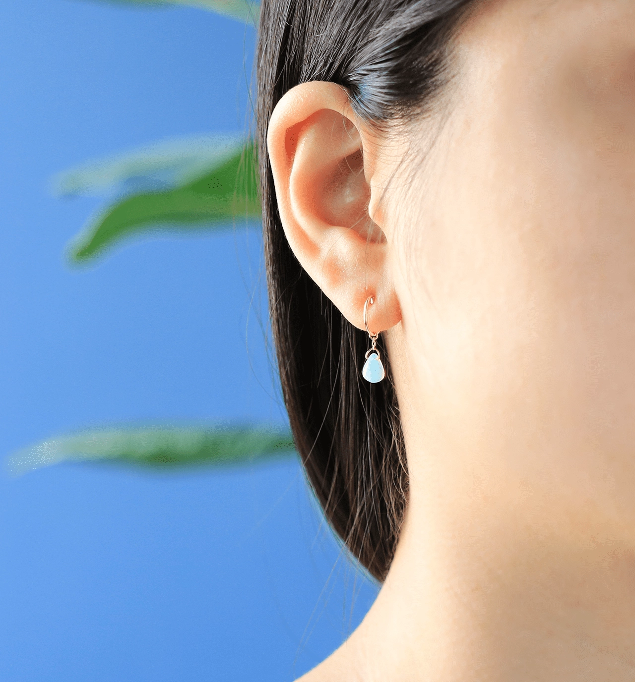 イヤリングと石のつなぎには極細な10金チェーンを使用し、石の魅力が最大限に引き立つようにしました。