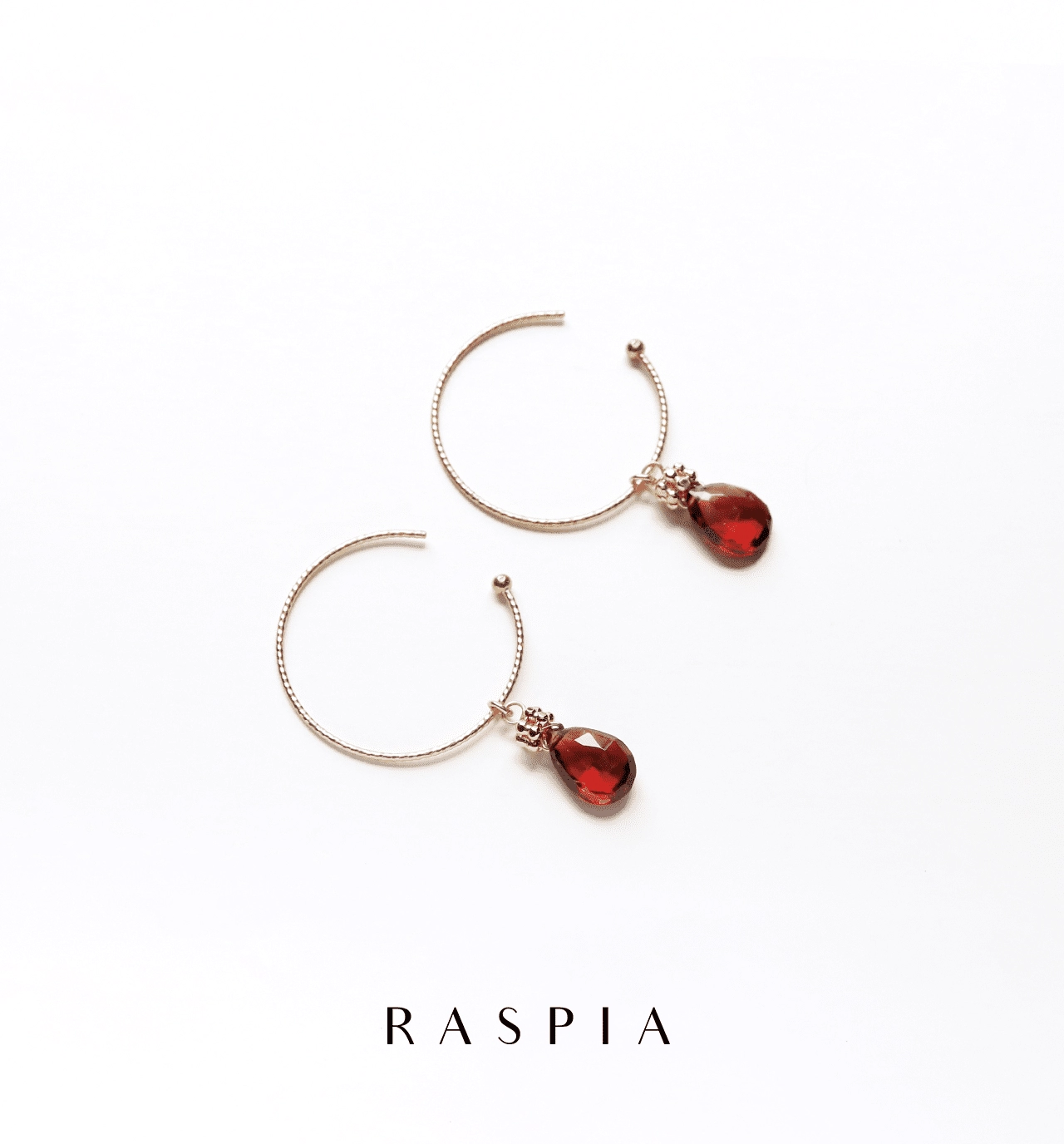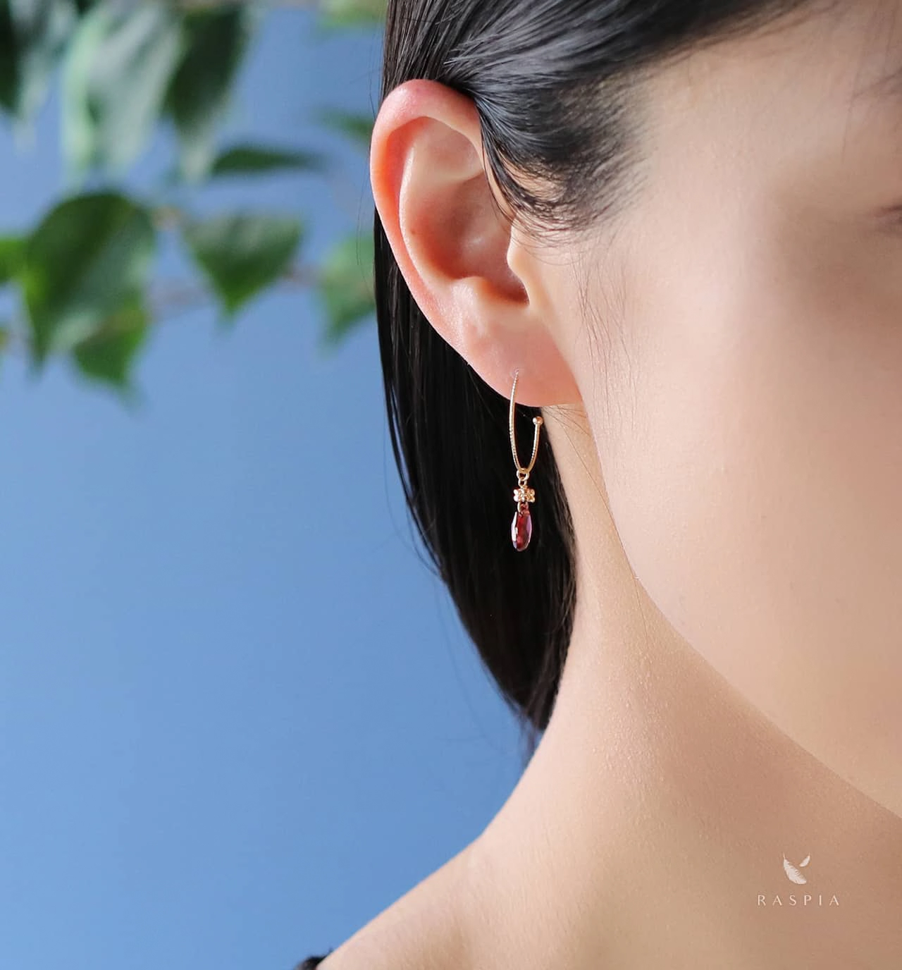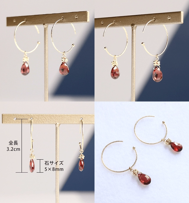 金属部分はK10パーツを使うことでより石に目が行くように工夫されています。 アルマンディンガーネットの深い赤色は大人の女性の魅力をより引き立たせ、アクセントの透明の輝きでピュア感もプラス。 フックとチャームは取り外し可能です。
