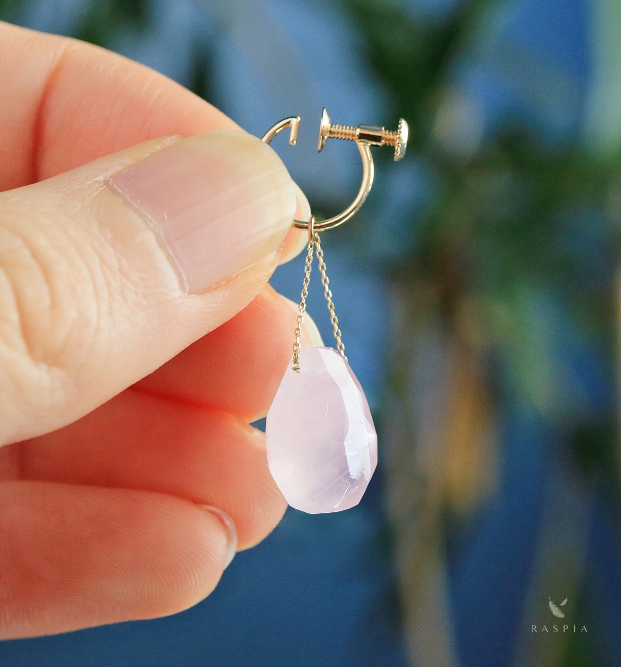 優しいピンク色と不規則な形が個性的で美しい、大粒のローズクォーツを使用したK10イヤリングです。