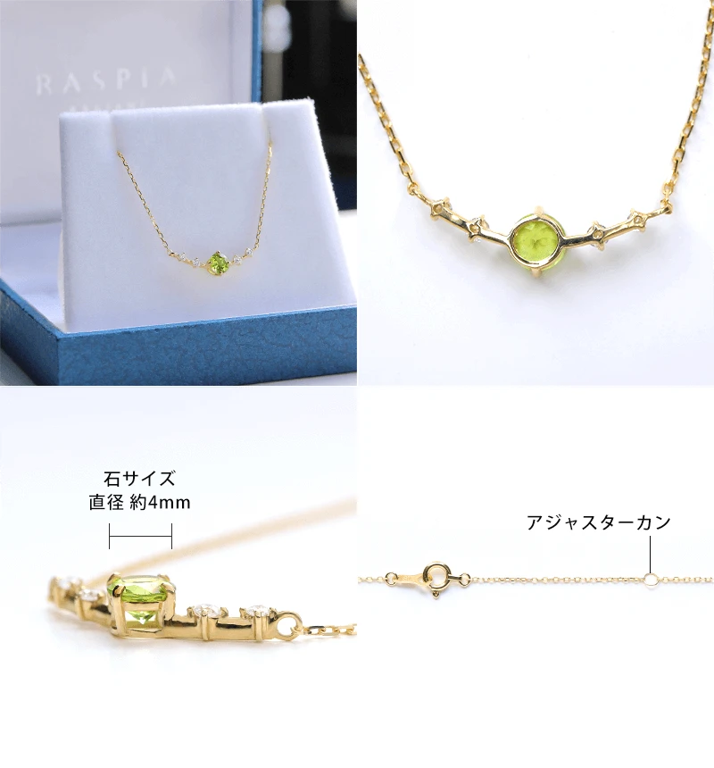 オリーブグリーンが美しいペリドットを使ったK18ネックレス。古代エジプトではペリドットは暗闇を照らす「太陽の石」と呼ばれ崇められていました。カラー、カット・研磨の質、透明度など、美しいルースを1粒ずつ厳選して買付しております。
