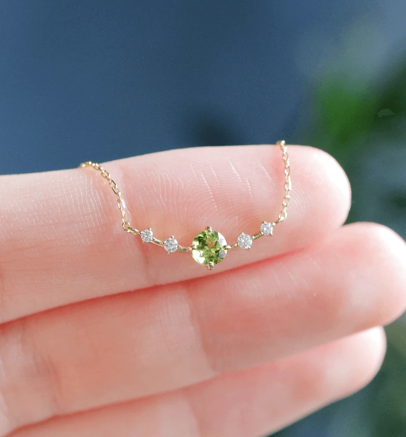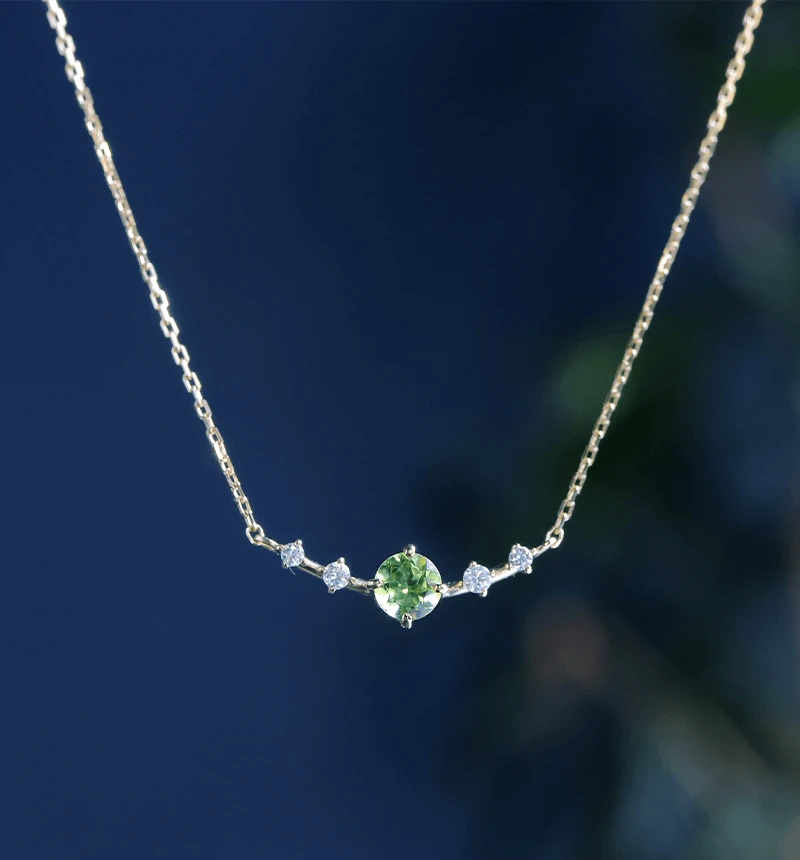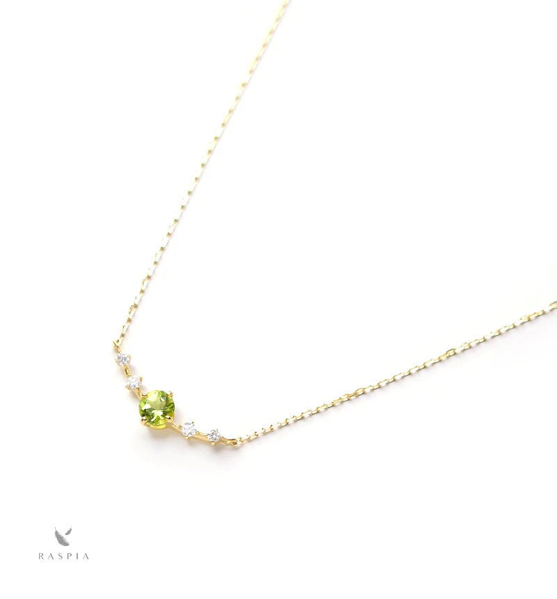 ペリドットのラウンドカットをメインに、4つのメレダイヤを配したK18ネックレスです。
