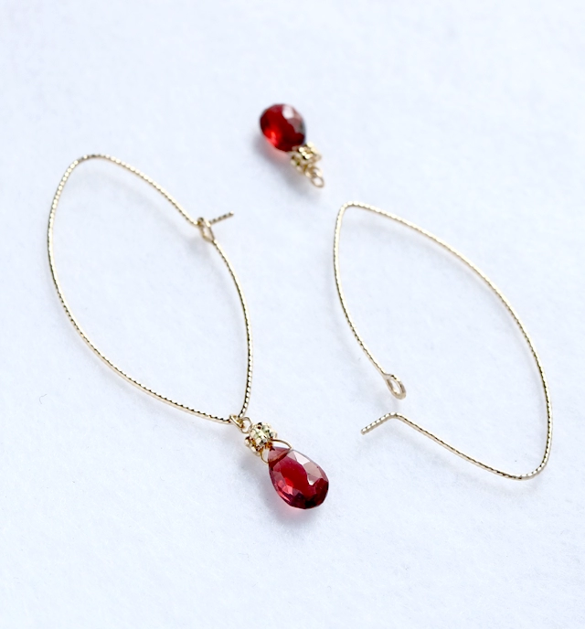 金属部分はK10パーツを使うことでより石に目が行くように工夫されています。 アルマンディンガーネットの深い赤色は大人の女性の魅力をより引き立たせ、アクセントの透明の輝きでピュア感もプラス。 フックとチャームは取り外し可能です。