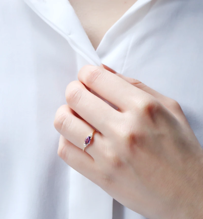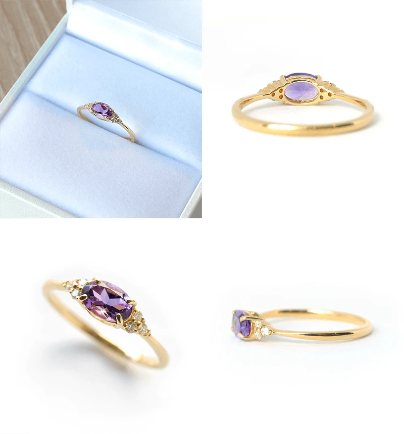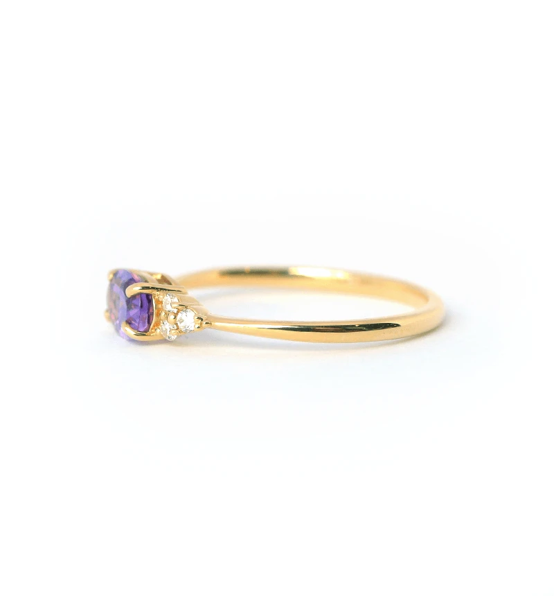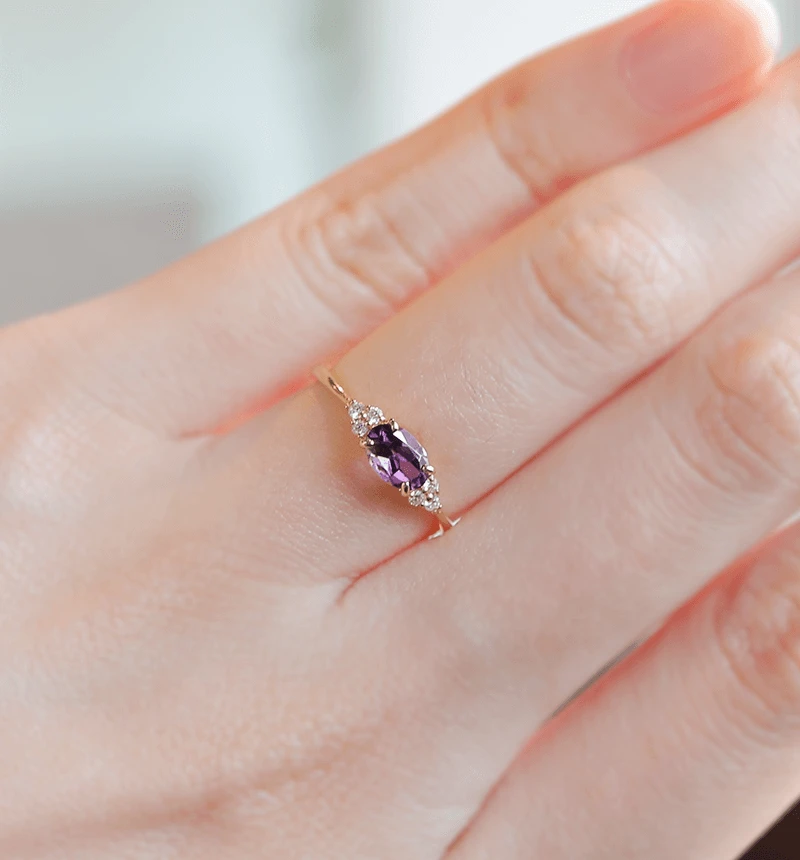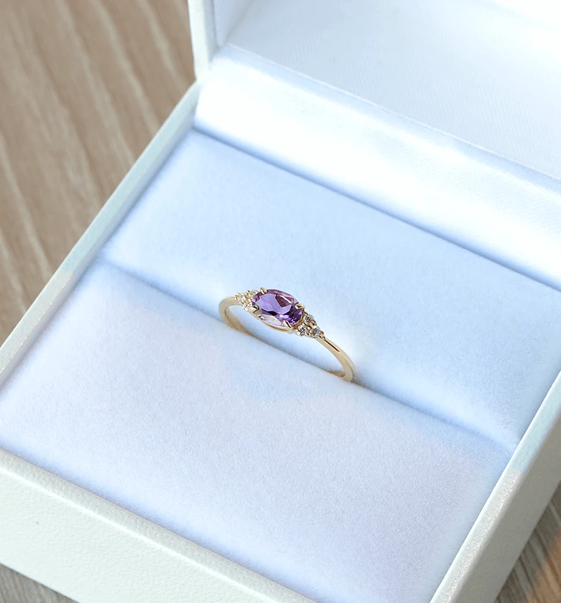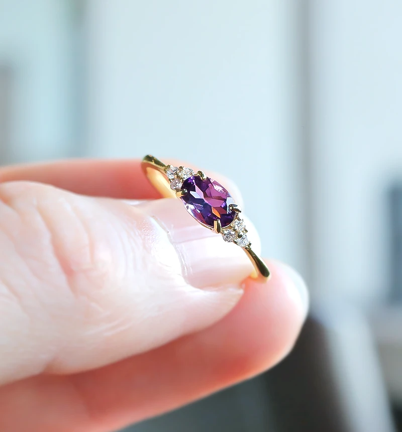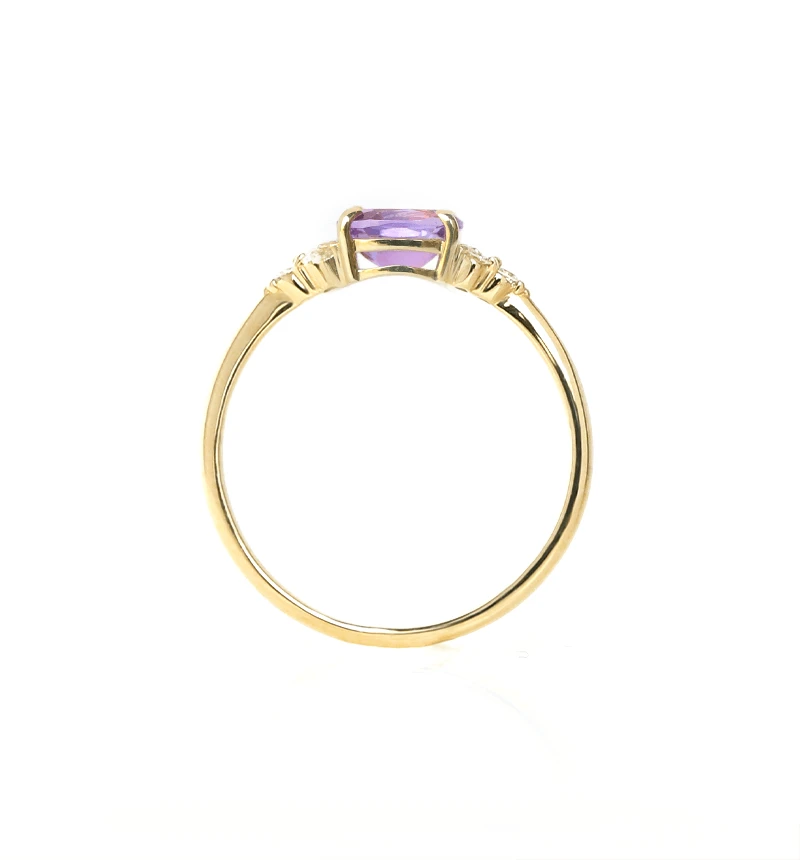 アメジストのオーバルカットをメインに、6つのメレダイヤを左右にセットしたK18リングです。鮮やかで濃厚なパープルカラーが美しいアメシストは人気の宝石です。また2月の誕生石です。