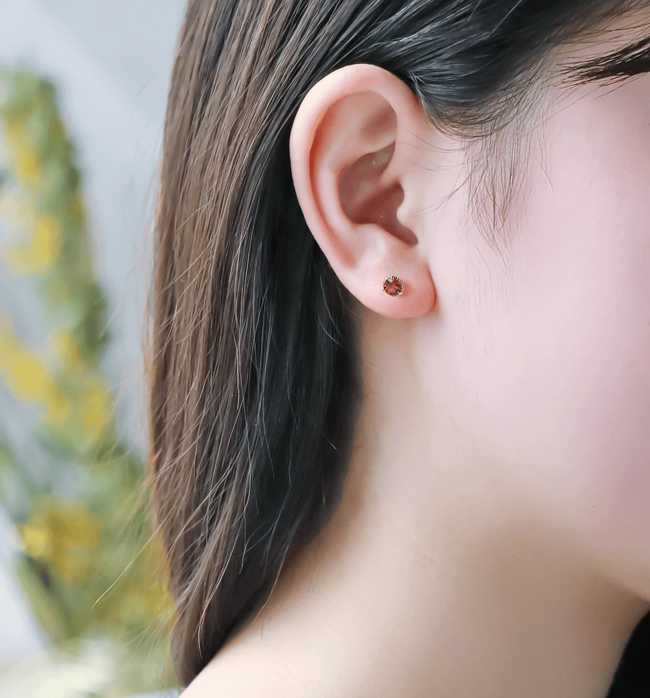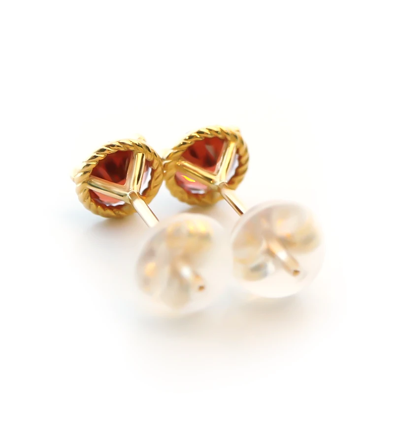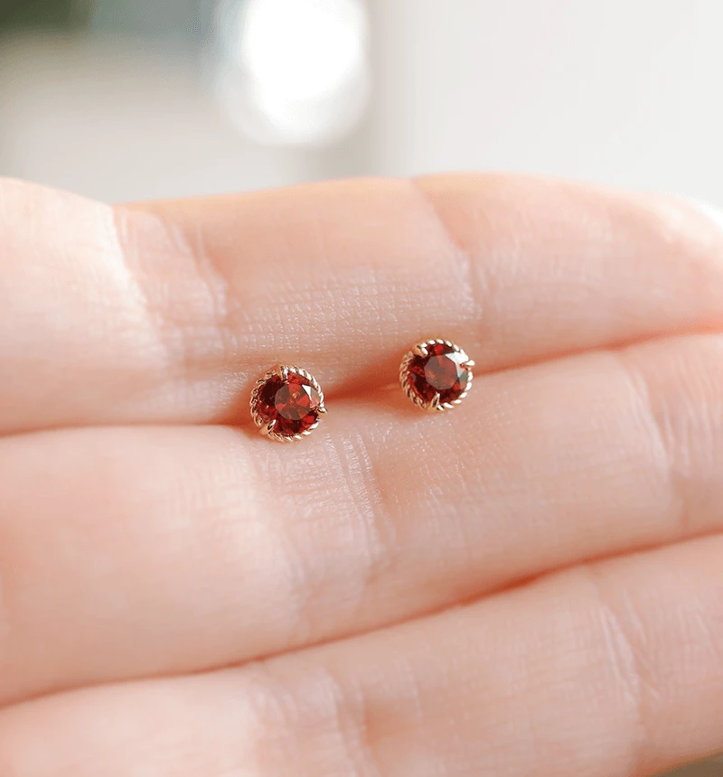 特有のレッドカラーが魅力的な人気の宝石です。ラウンドにファセットカットを施したガーネットを18金のヨリ線の縁取りの台座にシンプルなピアスに仕立てました。