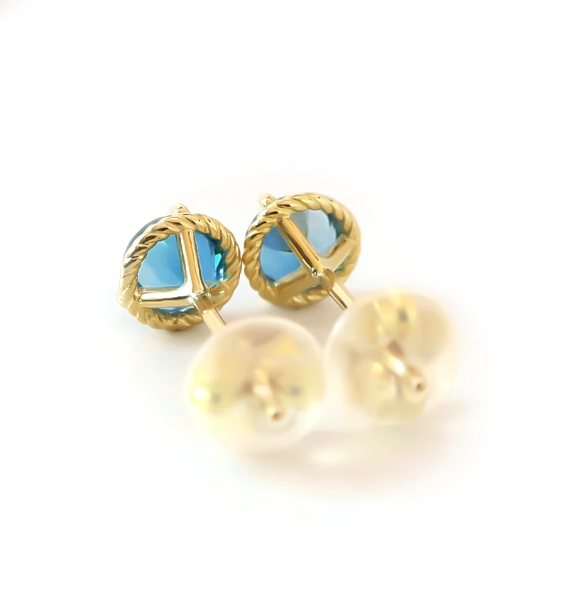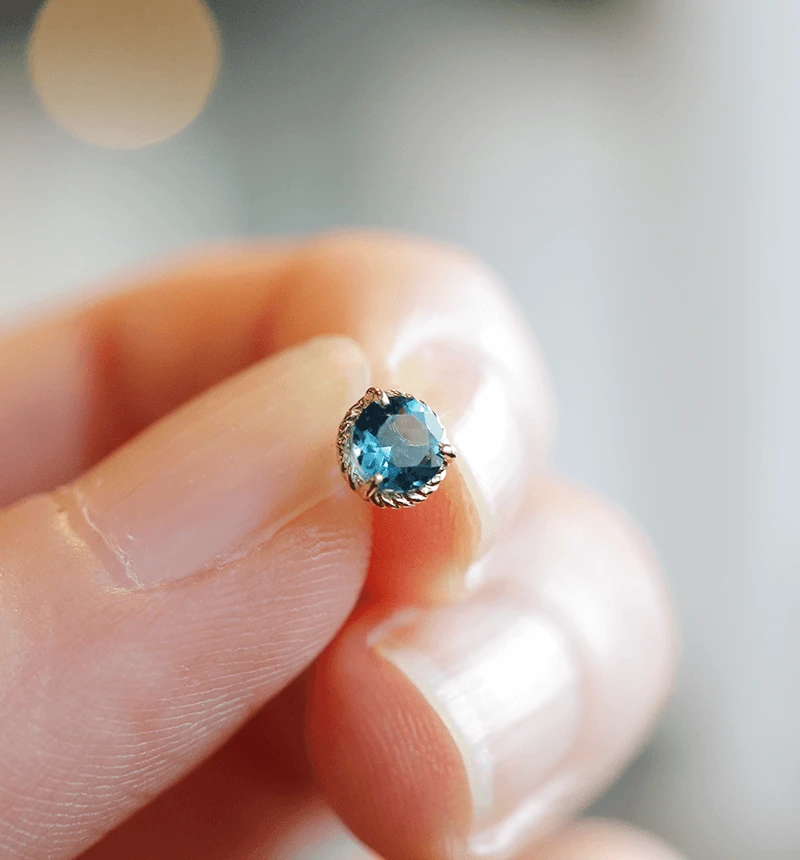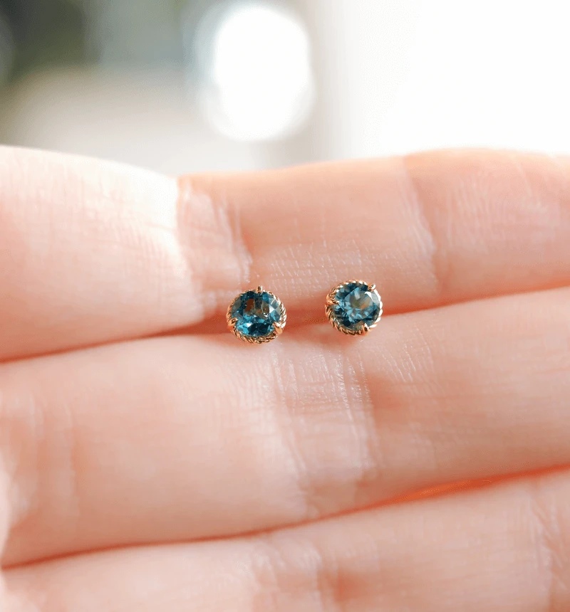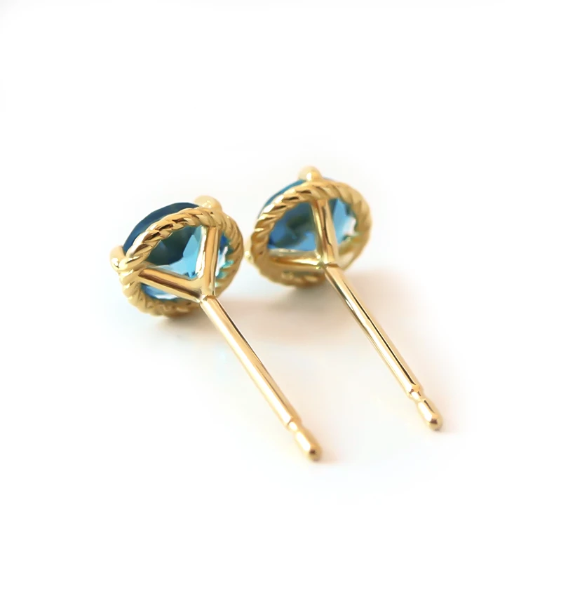 海を閉じ込めたような色合いのロンドンブルートパーズ。ラウンドにファセットカットを施したロンドンブルートパーズを18金のヨリ線の縁取りの台座にシンプルなピアスに仕立てました。