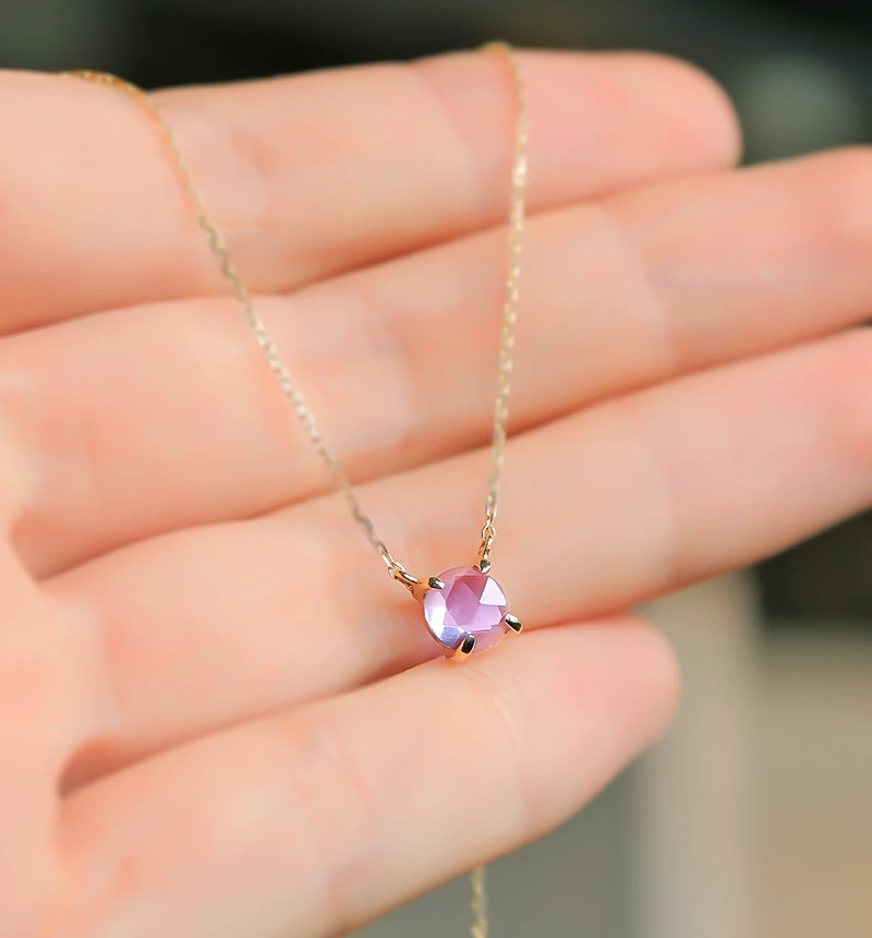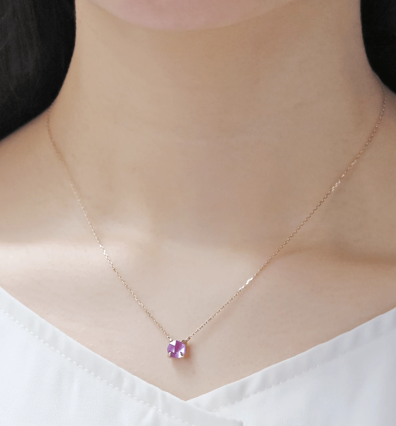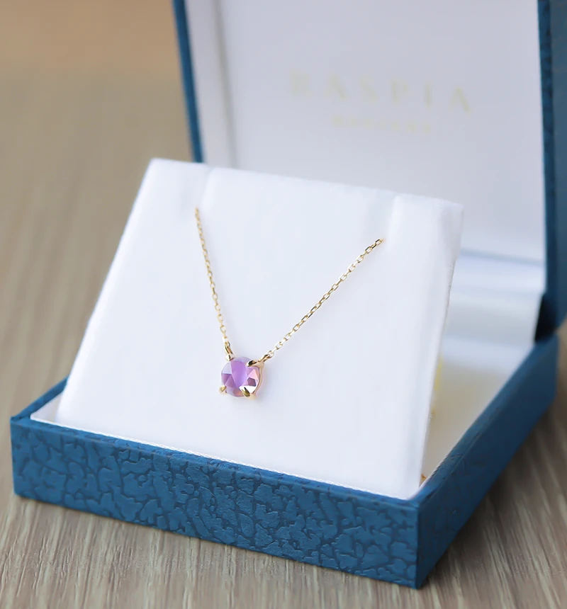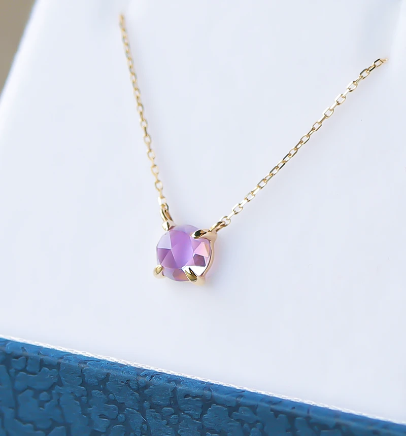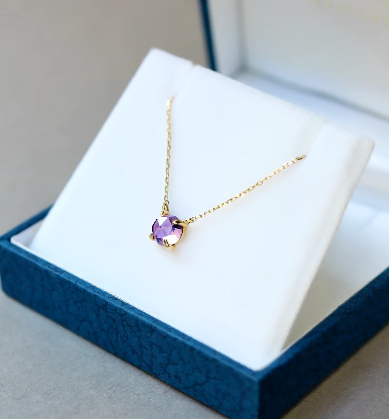 鮮やかなパープルカラーが美しいローズカットのアメジストを使用したK10ネックレスです。ローズカットの表面に施された24面のカット面が光を反射し、キラキラと美しく輝きます。アメジストは2月の誕生石です。