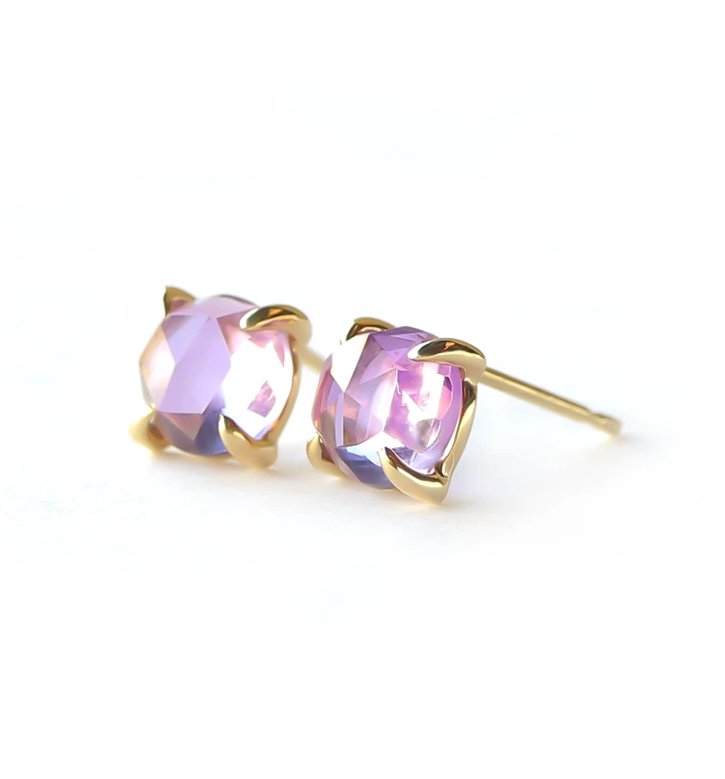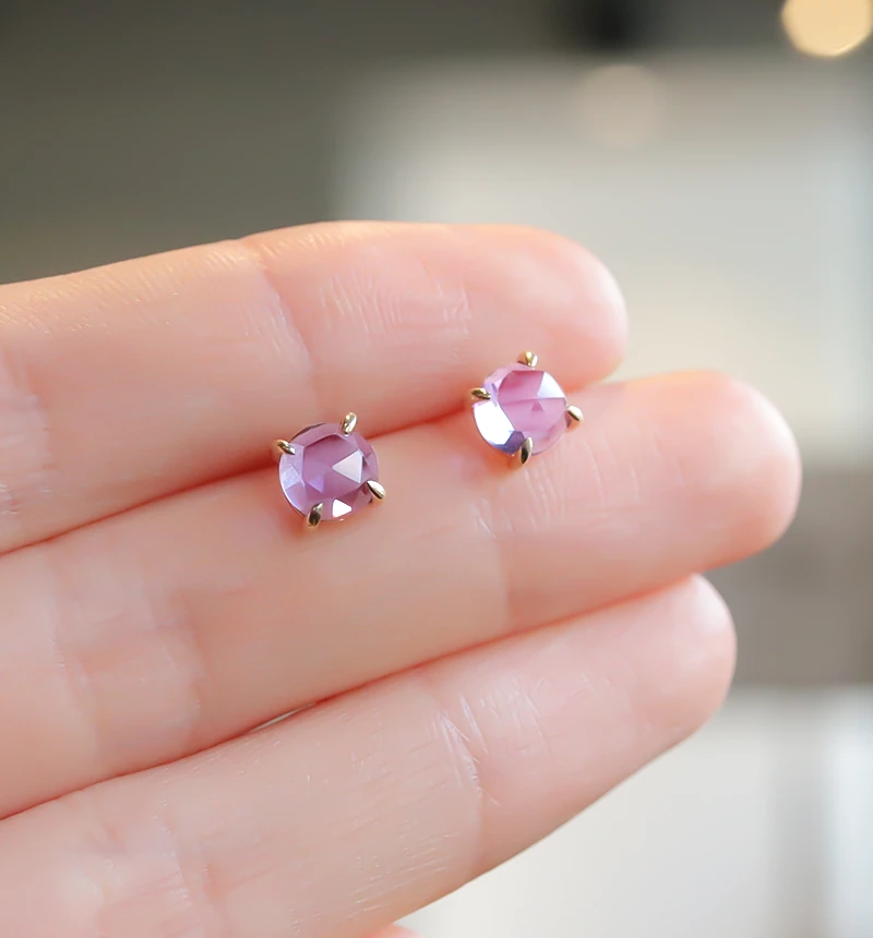 鮮やかなパープルカラーが美しいローズカットのアメジストを使用したK10ポストピアスです。ローズカットの表面に施された24面のカット面が光を反射し、キラキラと美しく輝きます。アメジストは2月の誕生石です。