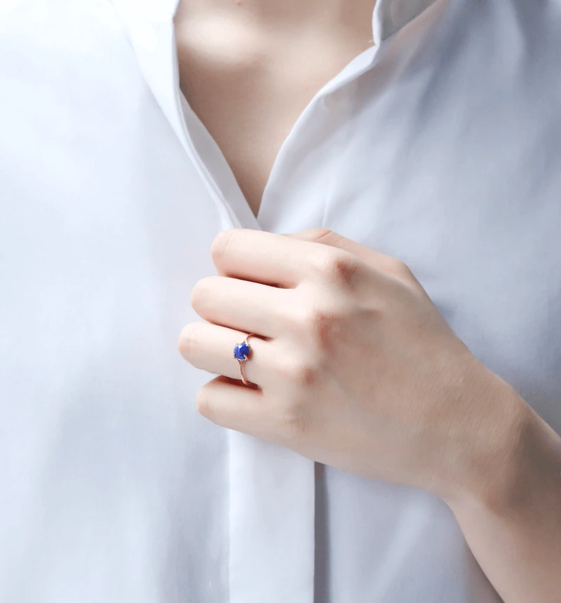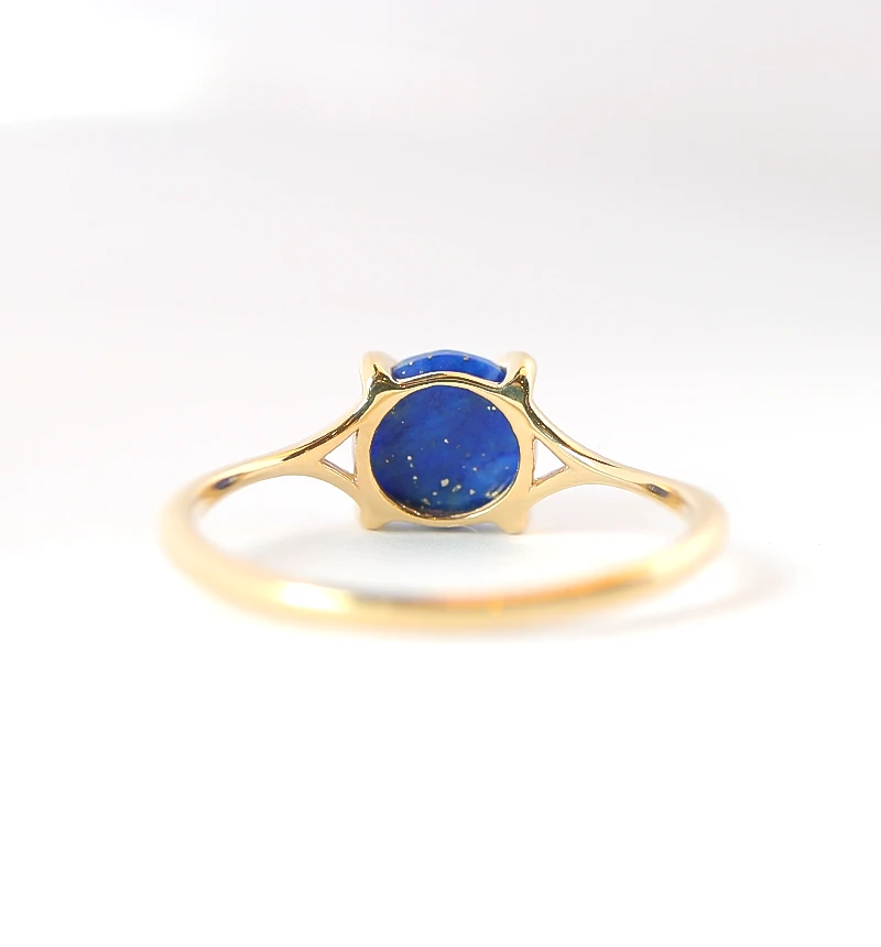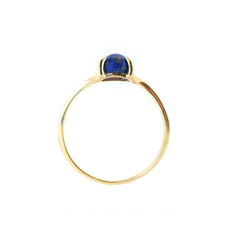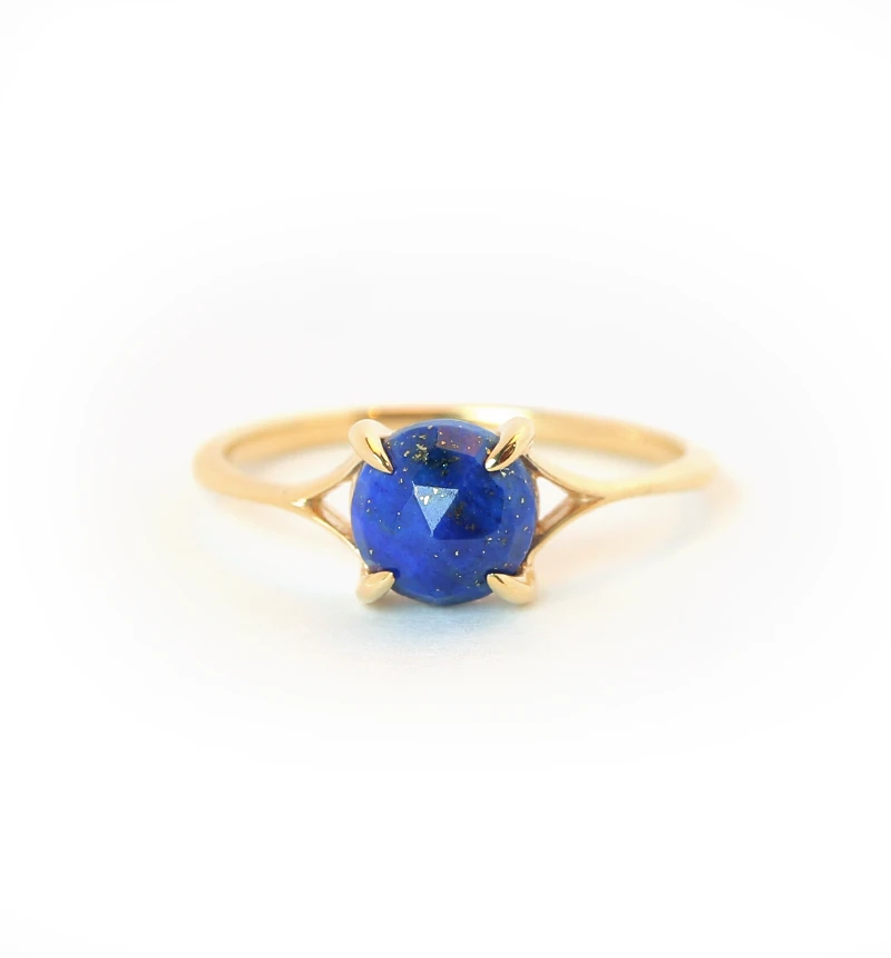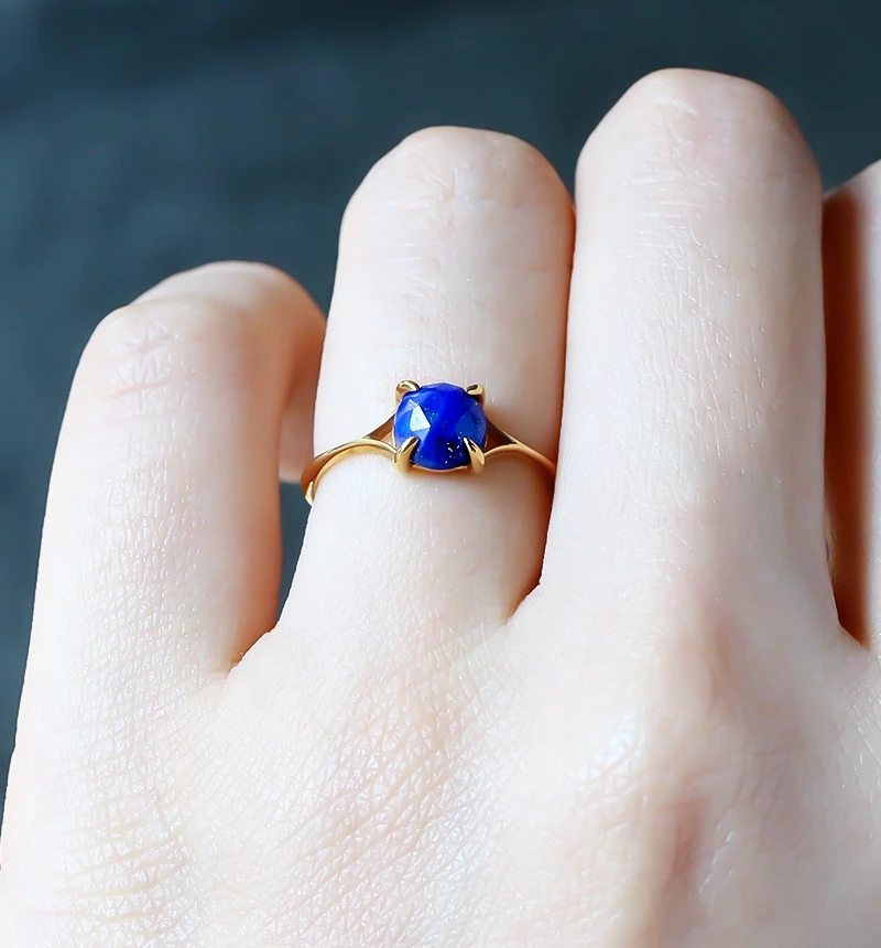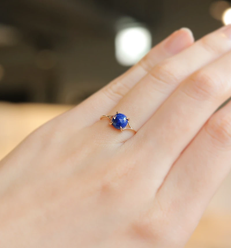 深い青の瑠璃色が魅力的なローズカットのラピスラズリを使用したK10リングです。ローズカットの表面に施された24面のカット面が光を反射し、キラキラと美しく輝きます。ラピスラズリは12月の誕生石です。
