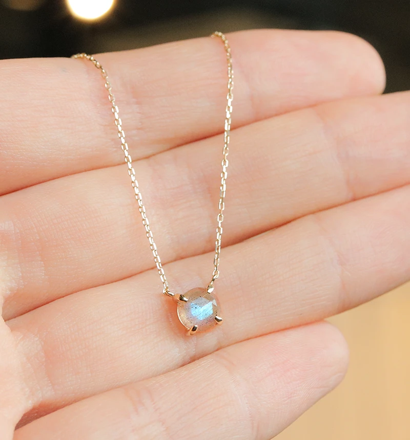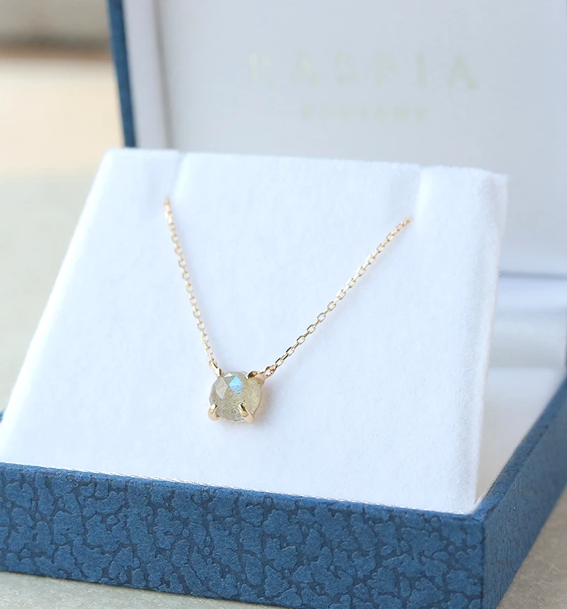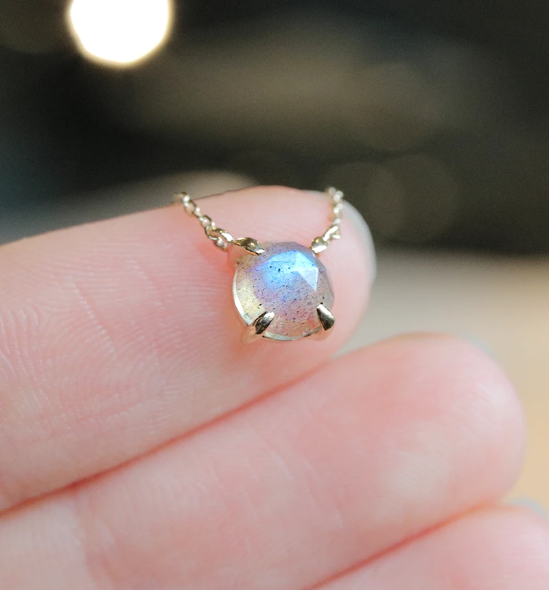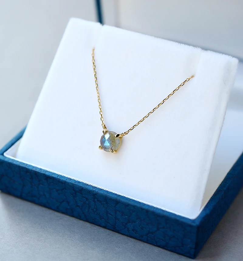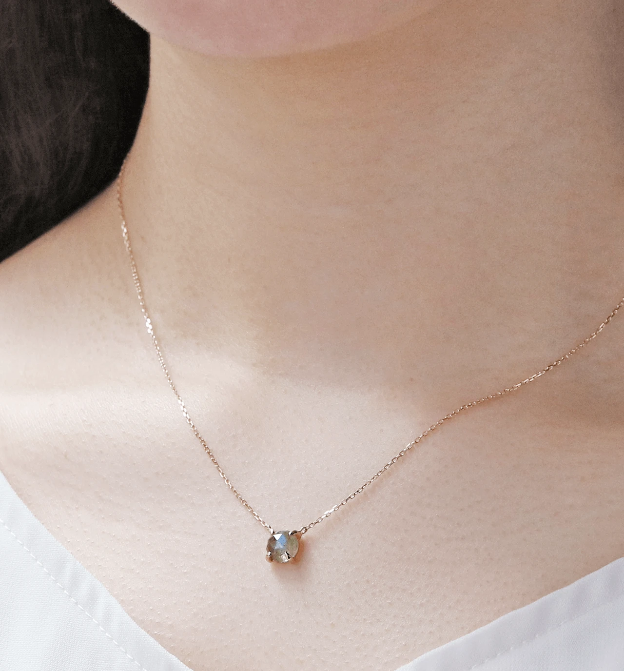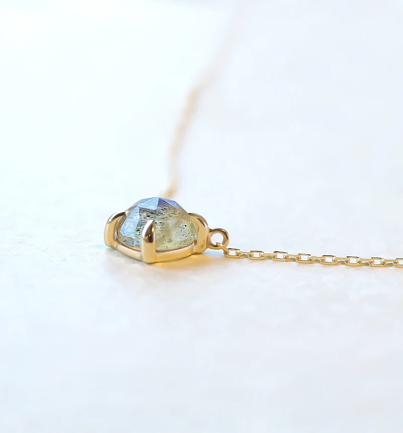 シラーと呼ばれる特有の輝きが美しい、ローズカットのラブラドライトを使用したK10ネックレスです。ローズカットの表面に施された24面のカット面が光を反射し、キラキラと美しく輝きます。