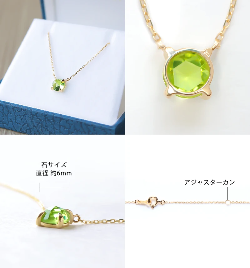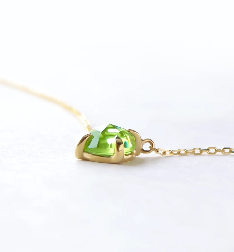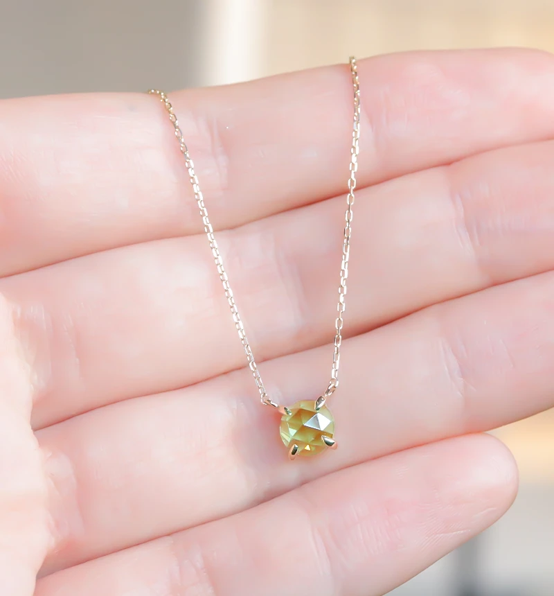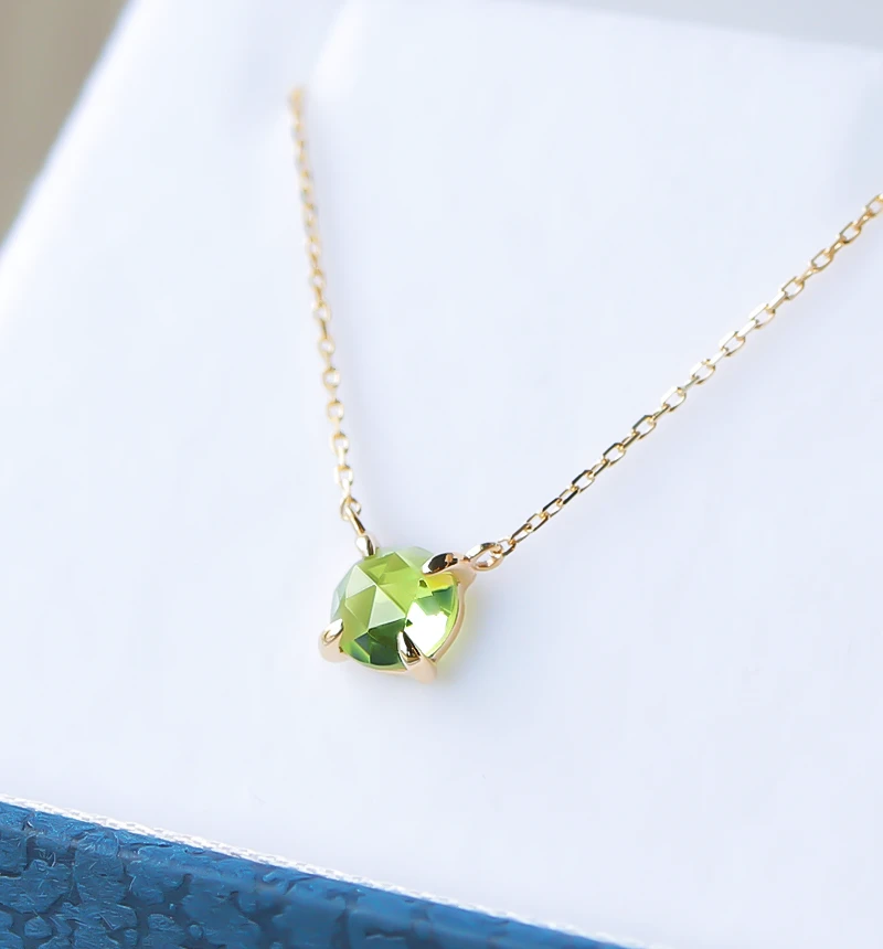 オリーブグリーンが美しいローズカットのペリドットを使用したK10ネックレスです。ローズカットの表面に施された24面のカット面が光を反射し、キラキラと美しく輝きます。ペリドットは8月の誕生石です。
