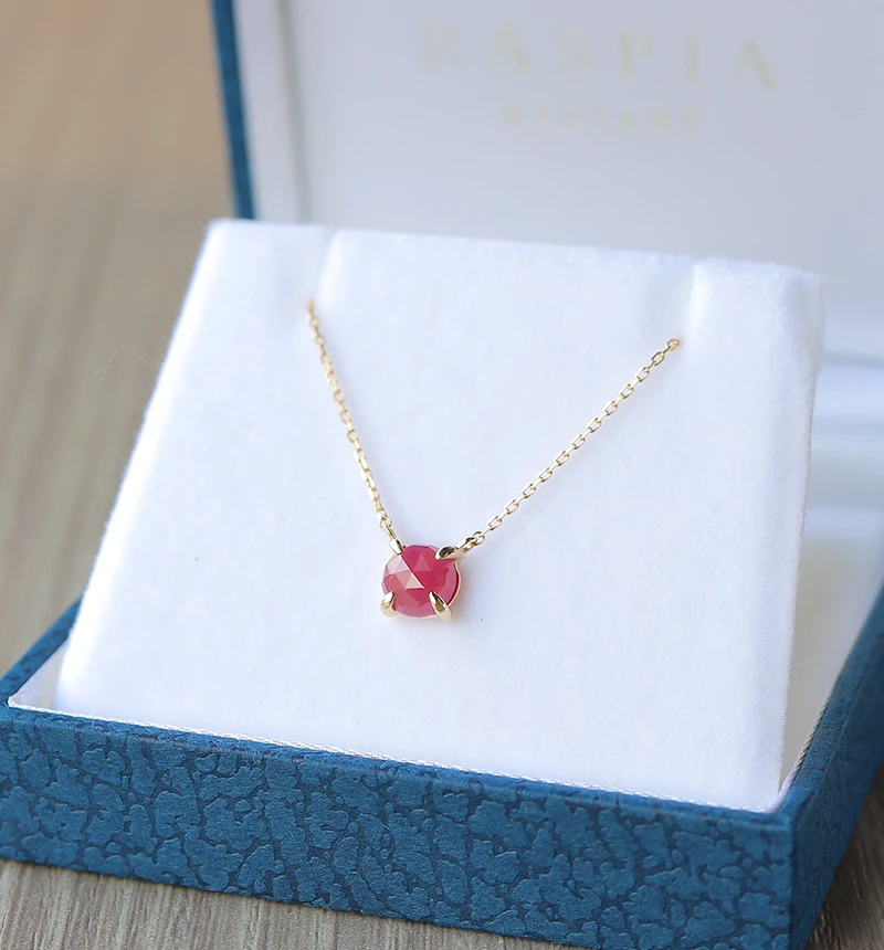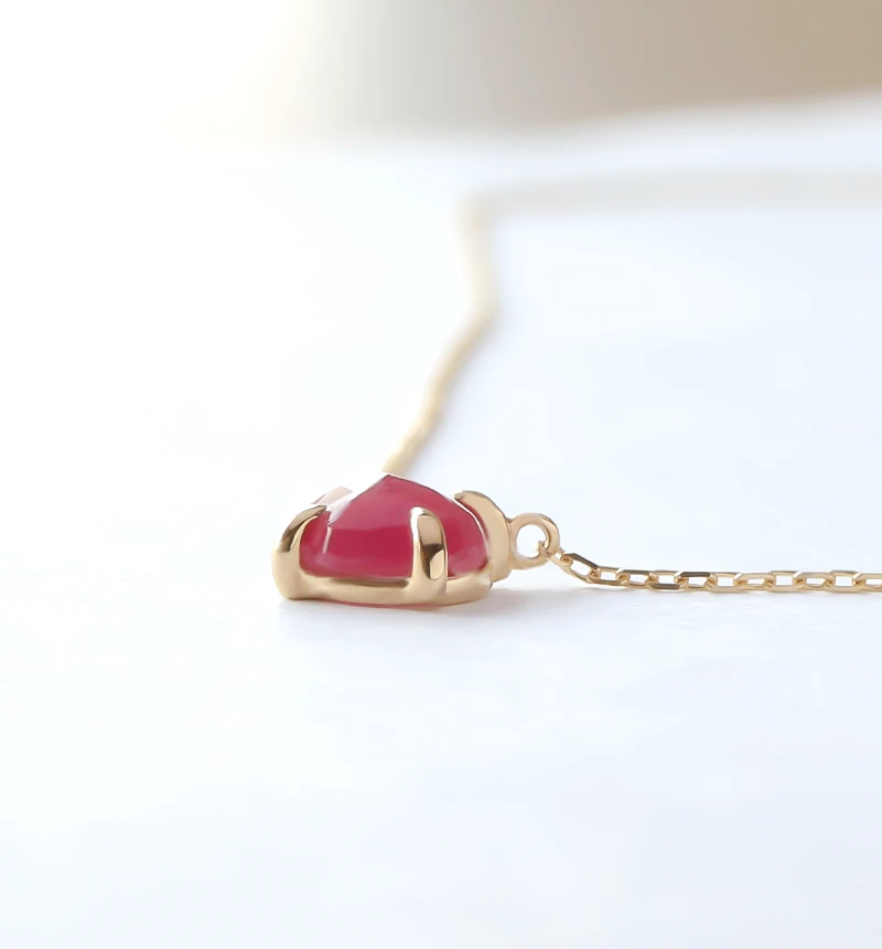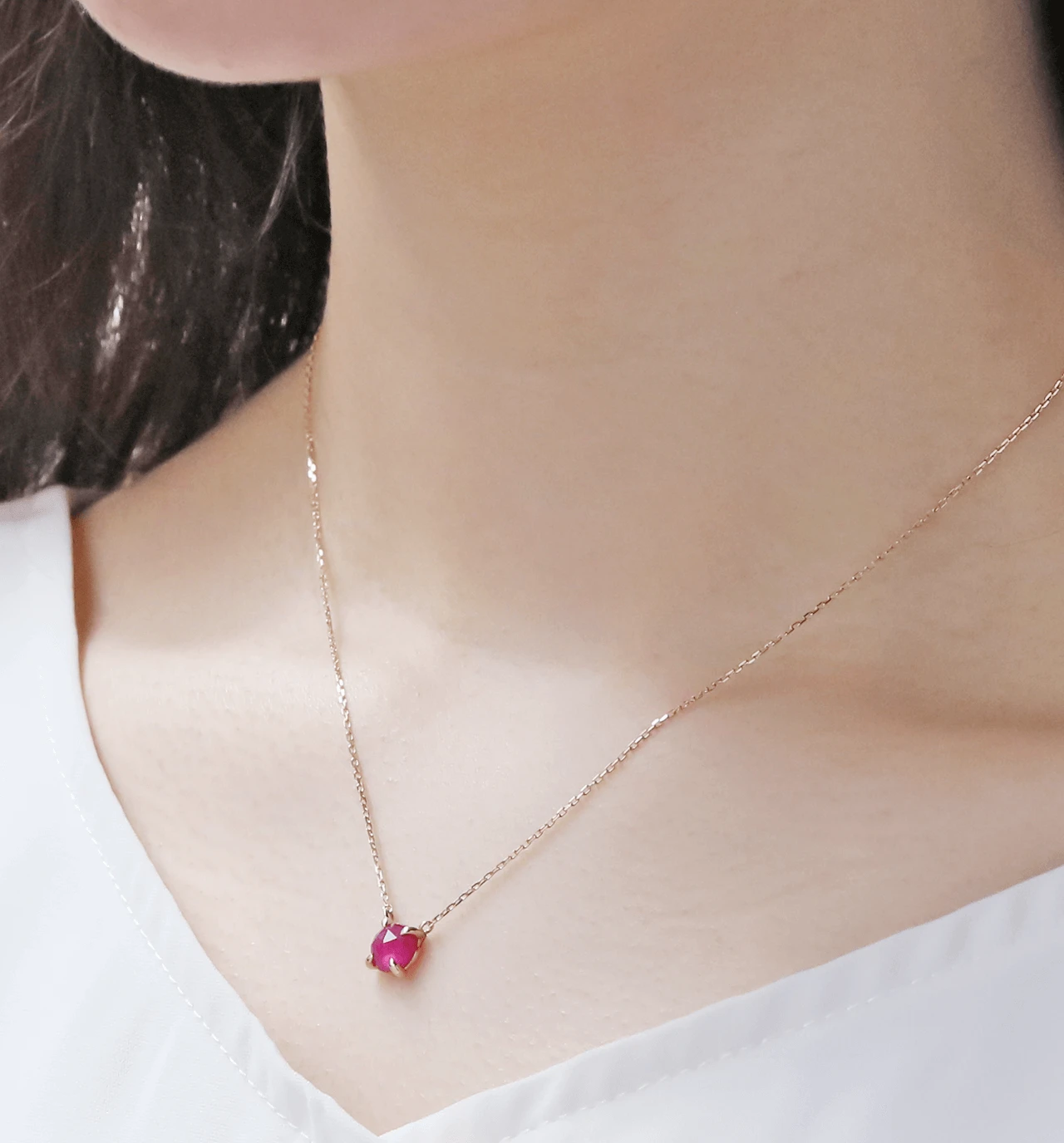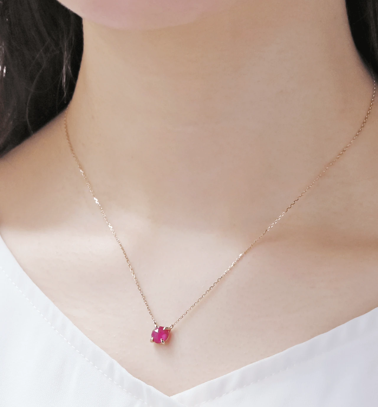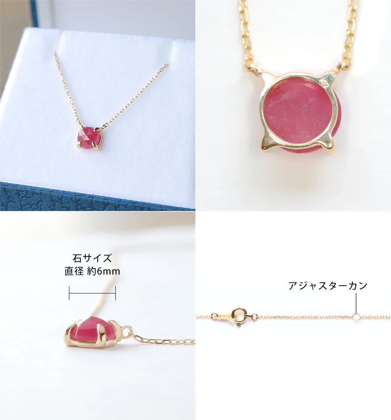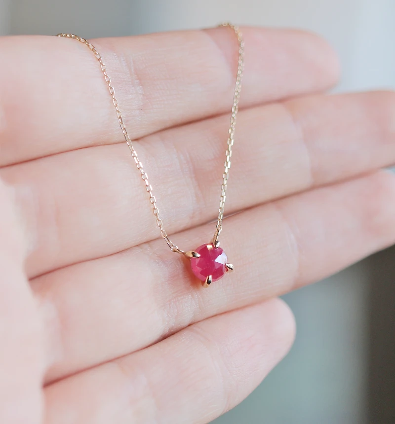燃え盛る炎のように情熱的に輝くローズカットのルビーを使用したK10ネックレスです。ローズカットの表面に施された24面のカット面が光を反射し、キラキラと美しく輝きます。ルビーは7月の誕生石です。