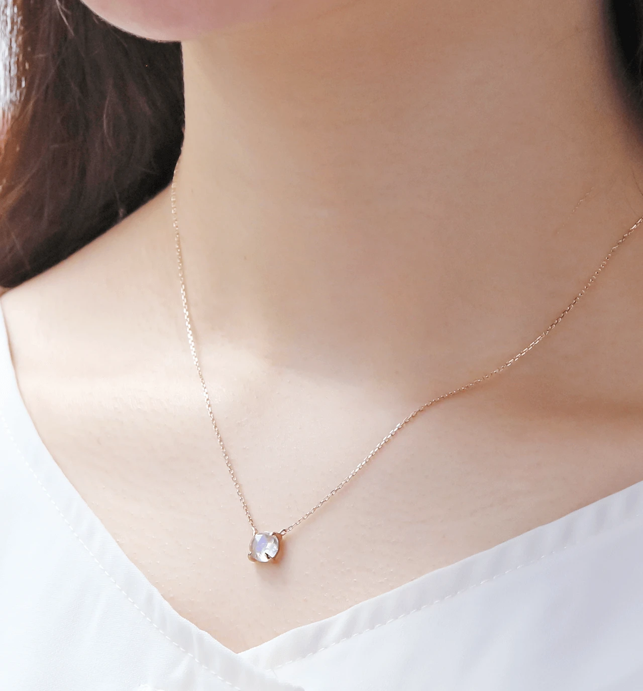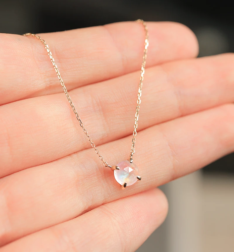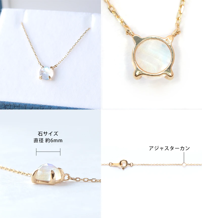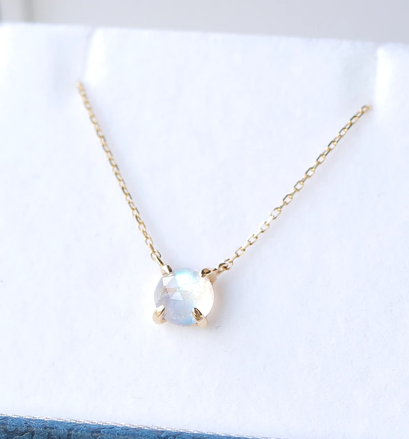 鮮やかなブルーのシラーが美しいローズカットのブルームーンストーンを使用したK10ネックレスです。ローズカットの表面に施された24面のカット面が光を反射し、キラキラと美しく輝きます。ブルームーンストーンは6月の誕生石です。