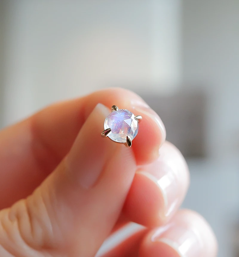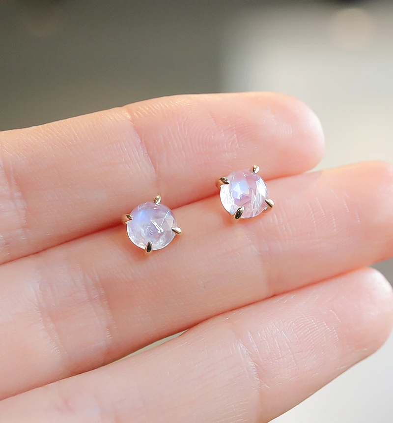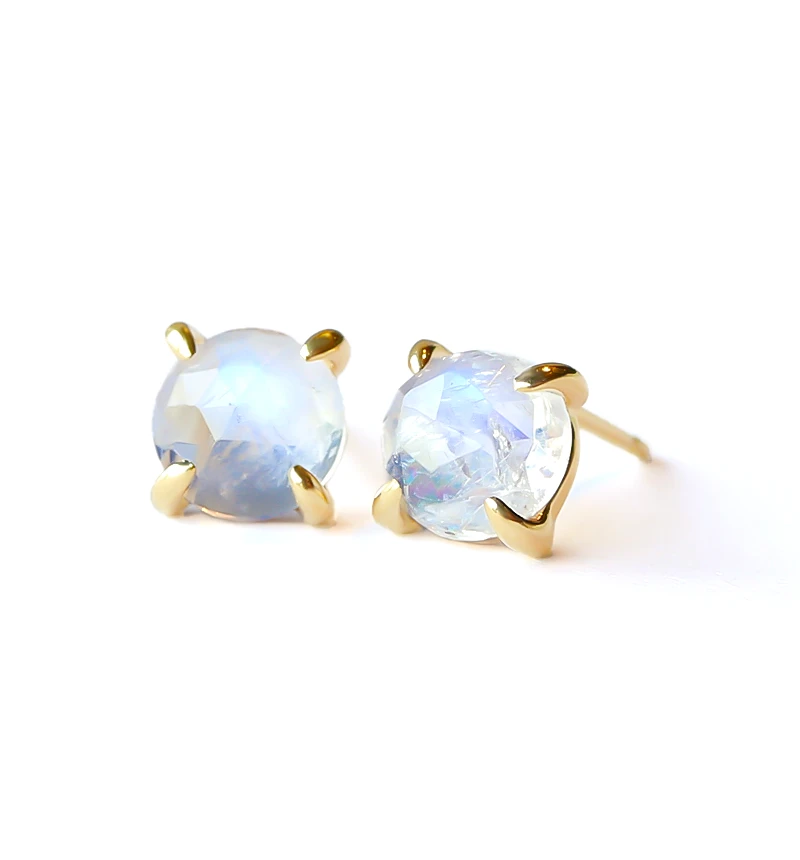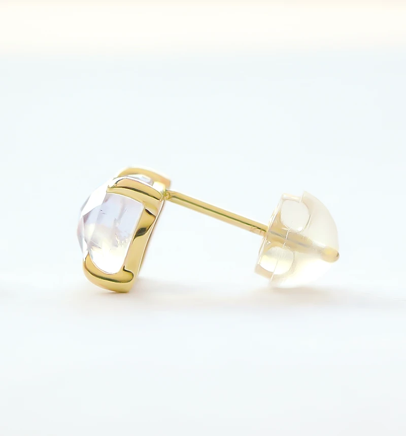 鮮やかなブルーのシラーが美しいローズカットのブルームーンストーンを使用したK10ポストピアスです。ローズカットの表面に施された24面のカット面が光を反射し、キラキラと美しく輝きます。ブルームーンストーンは6月の誕生石です。