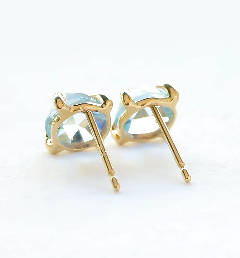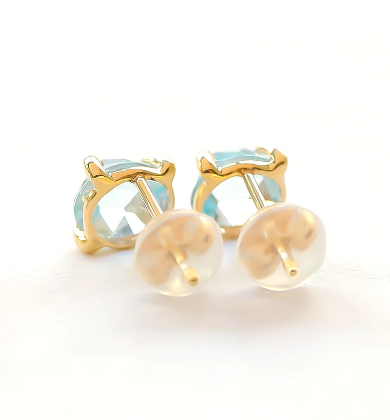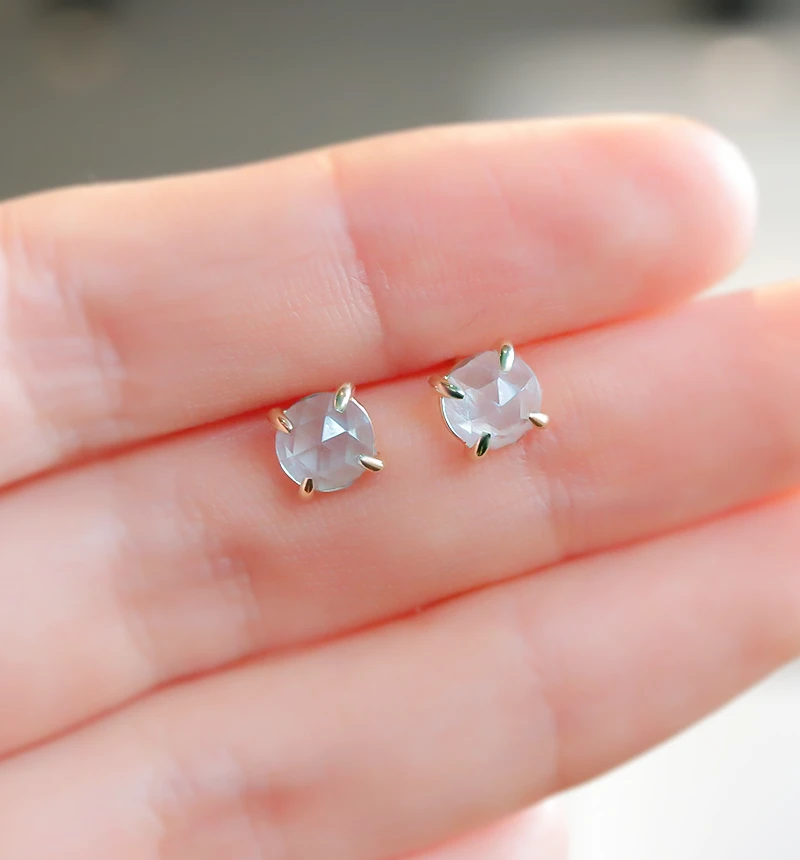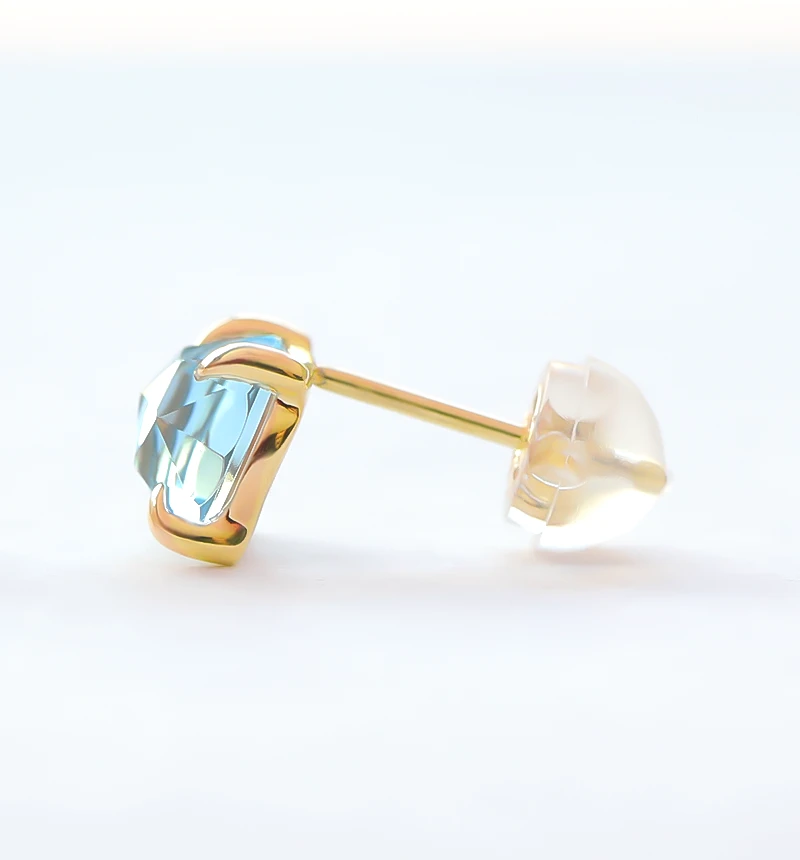 涼やかなブルーの発色と煌きが美しいローズカットのスカイブルートパーズを使用したK10ポストピアスです。ローズカットの表面に施された24面のカット面が光を反射し、キラキラと美しく輝きます。スカイブルートパーズは11月の誕生石です。