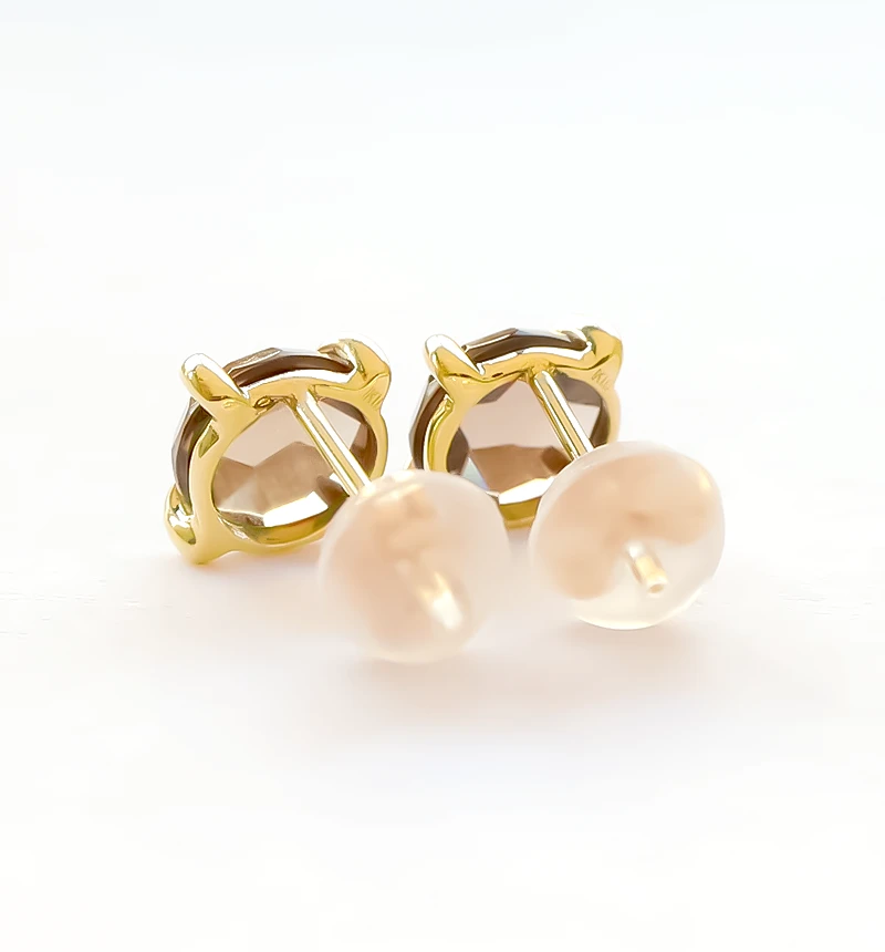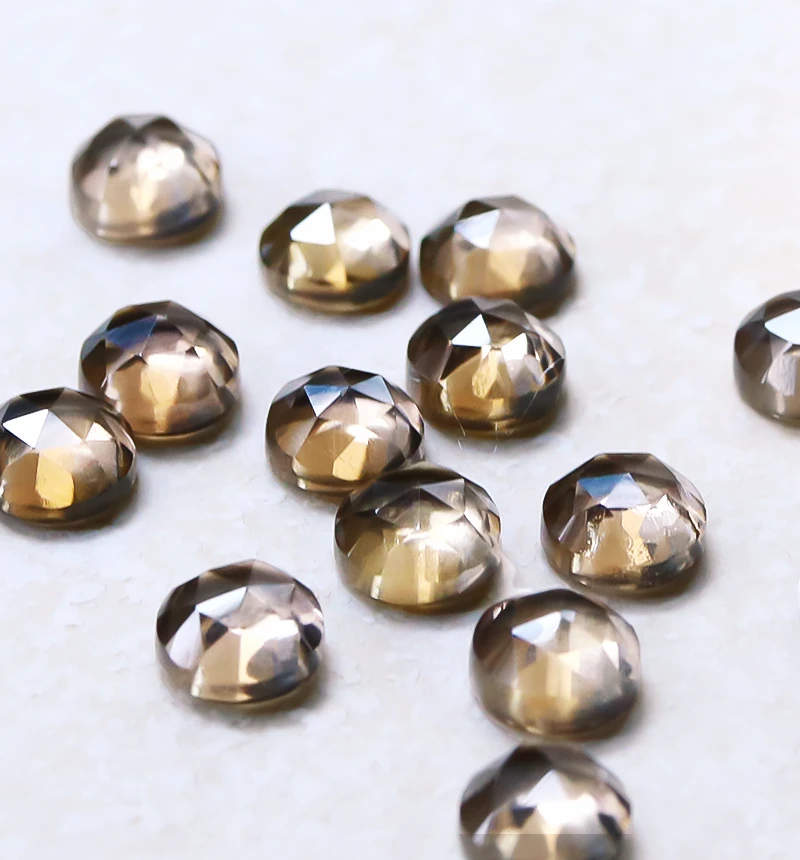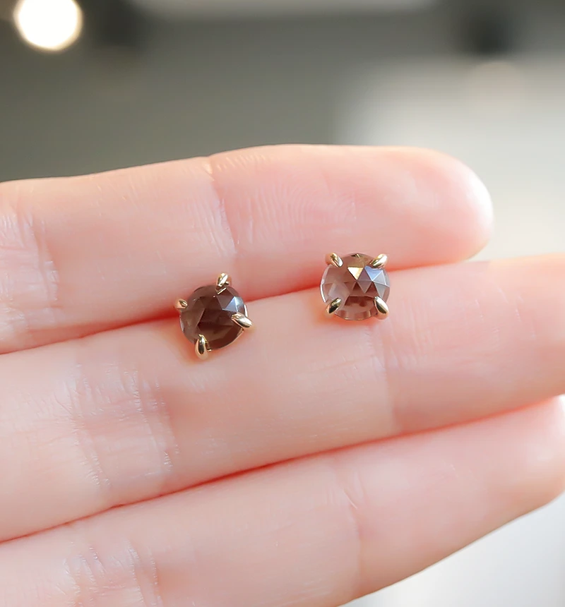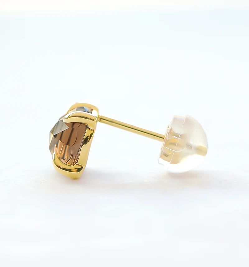 アンニュイな雰囲気漂い、上品な色合いが特徴であるローズカットのスモーキークォーツを使用したK10ポストピアスです。ローズカットの表面に施された24面のカット面が光を反射し、キラキラと美しく輝きます。