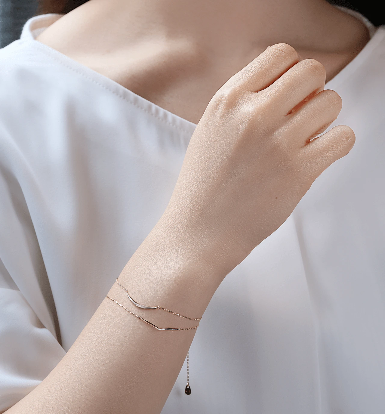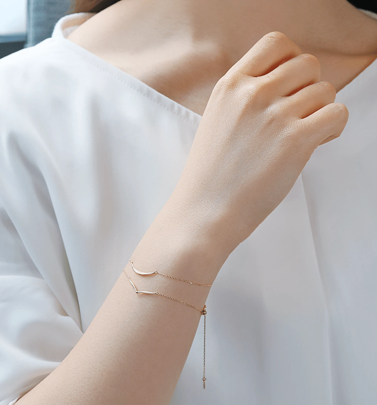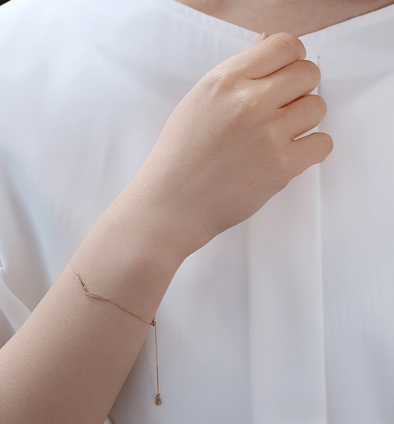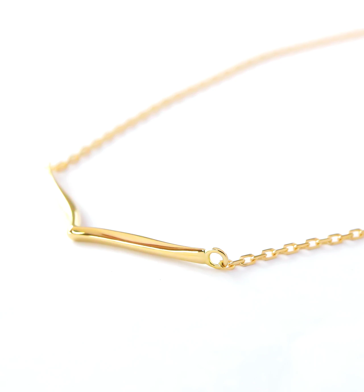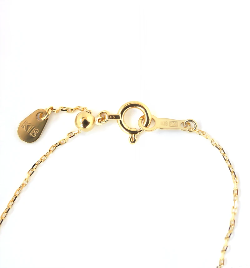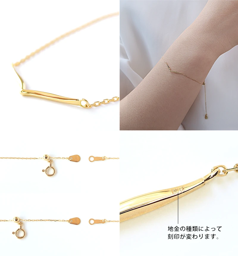 繊細なK10あずきチェーンのセンターにV字チャームをあしらったブレスレット。シンプルながらに存在感のある手元にしてくれます。