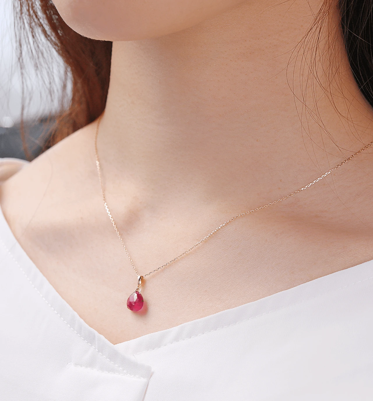 マロンカットのルビーが胸元で確かな存在感を放ちます。金具は石の存在を引き立てるサイズ感にこだわりました。また、身体の動きに合わせ石が揺れてきらめき、それでいて石がいつも正面を向くように絶妙なバランス調整を施しています。