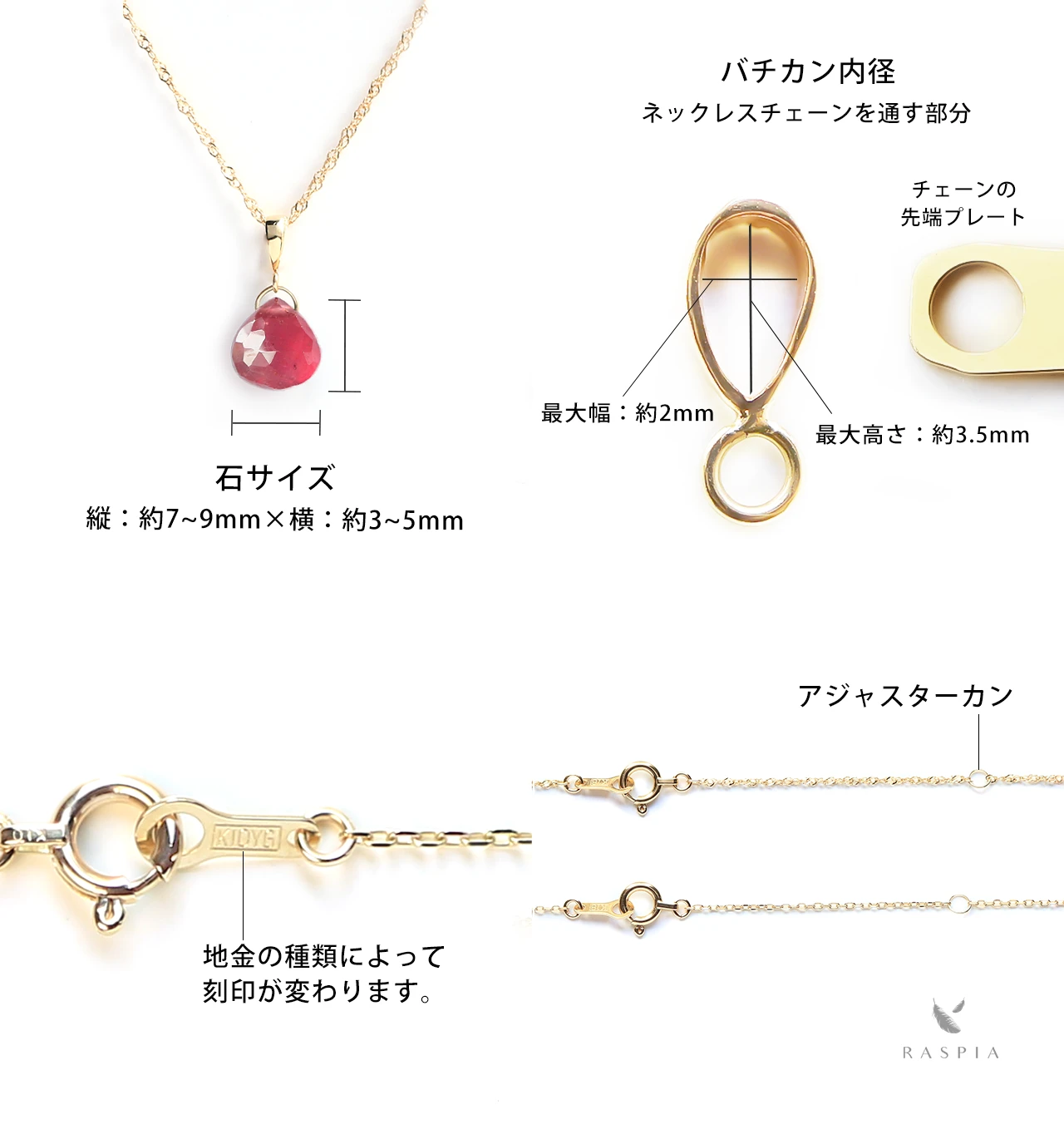| サイズ | ルビー:縦 約7~9mm × 横 約3~5mm バチカン内径:高さ 最大(約)3.5mm/幅 最大(約)2mm チェーン全長は40cm・45cm・50cmよりお選びいただけます。 | ||