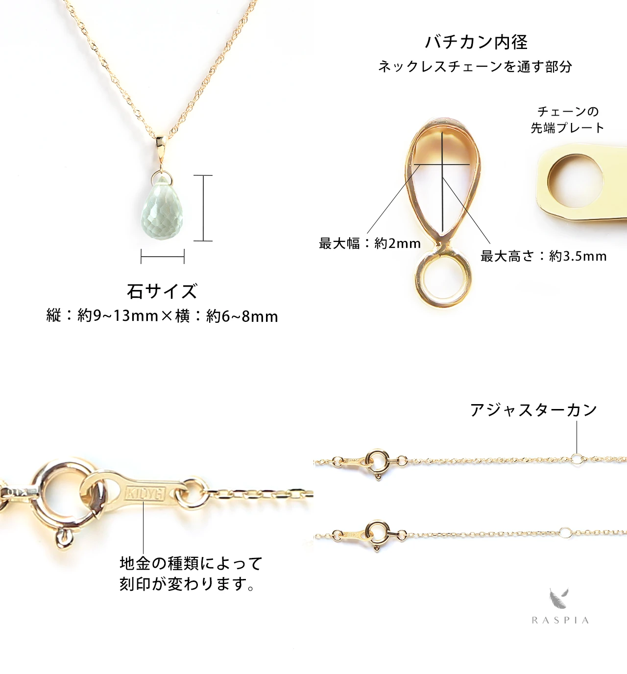 | サイズ | グリーンアメジスト:縦 約9~13mm × 横 約6~8mm バチカン内径:高さ 最大(約)3.5mm/幅 最大(約)2mm チェーン全長は40cm・45cm・50cmよりお選びいただけます。 | ||