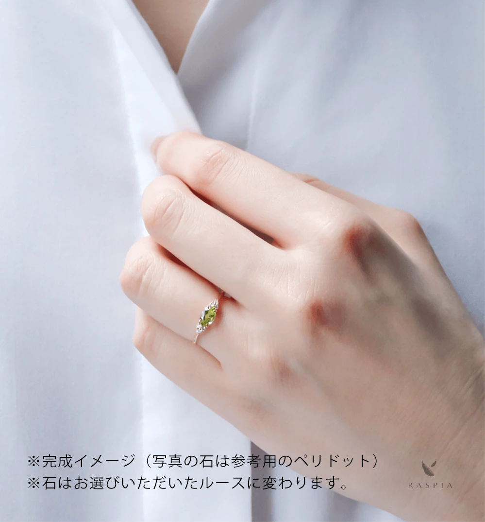 製作では、職人によって細部の仕上がりに気を配り、最後は丁寧に磨きあげます。デザイナー、宝石バイヤーを含めた厳しい品質チェックを通ったリングは鮮やかな輝きを長くお楽しみいただけます。地金は、K18イエローゴールド、ピンクゴールド、プラチナがお選びいただけます。