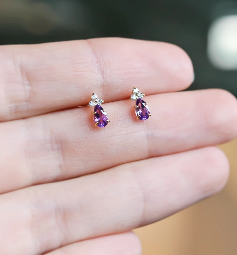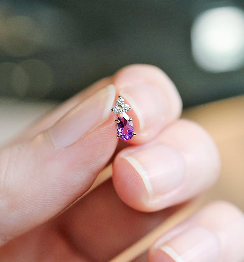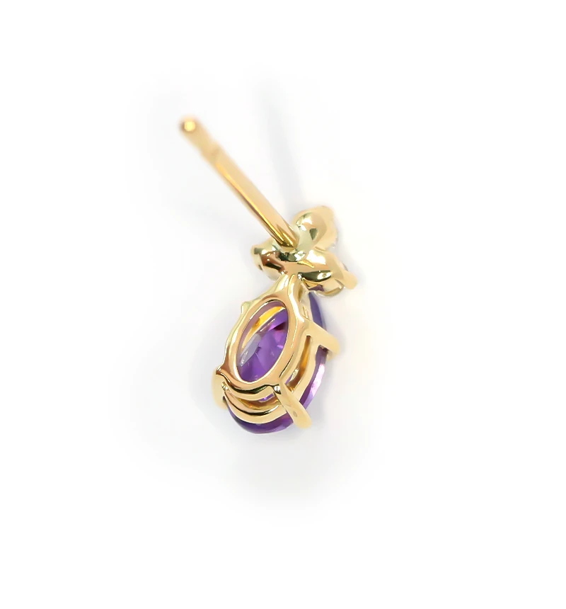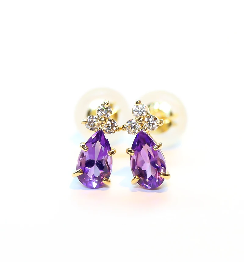 | 石 | 【個数】 ・アメジスト × 2石 ・ダイヤモンド × 6石(SI~VSクラス相当) 【サイズ】 ・アメジスト:約 3×5mm ・ダイヤモンド:直径 約 1.3mm 【カラット】 ・アメジスト:約 0.25ct × 2石 ・ダイヤモンド:0.01ct × 6石 |