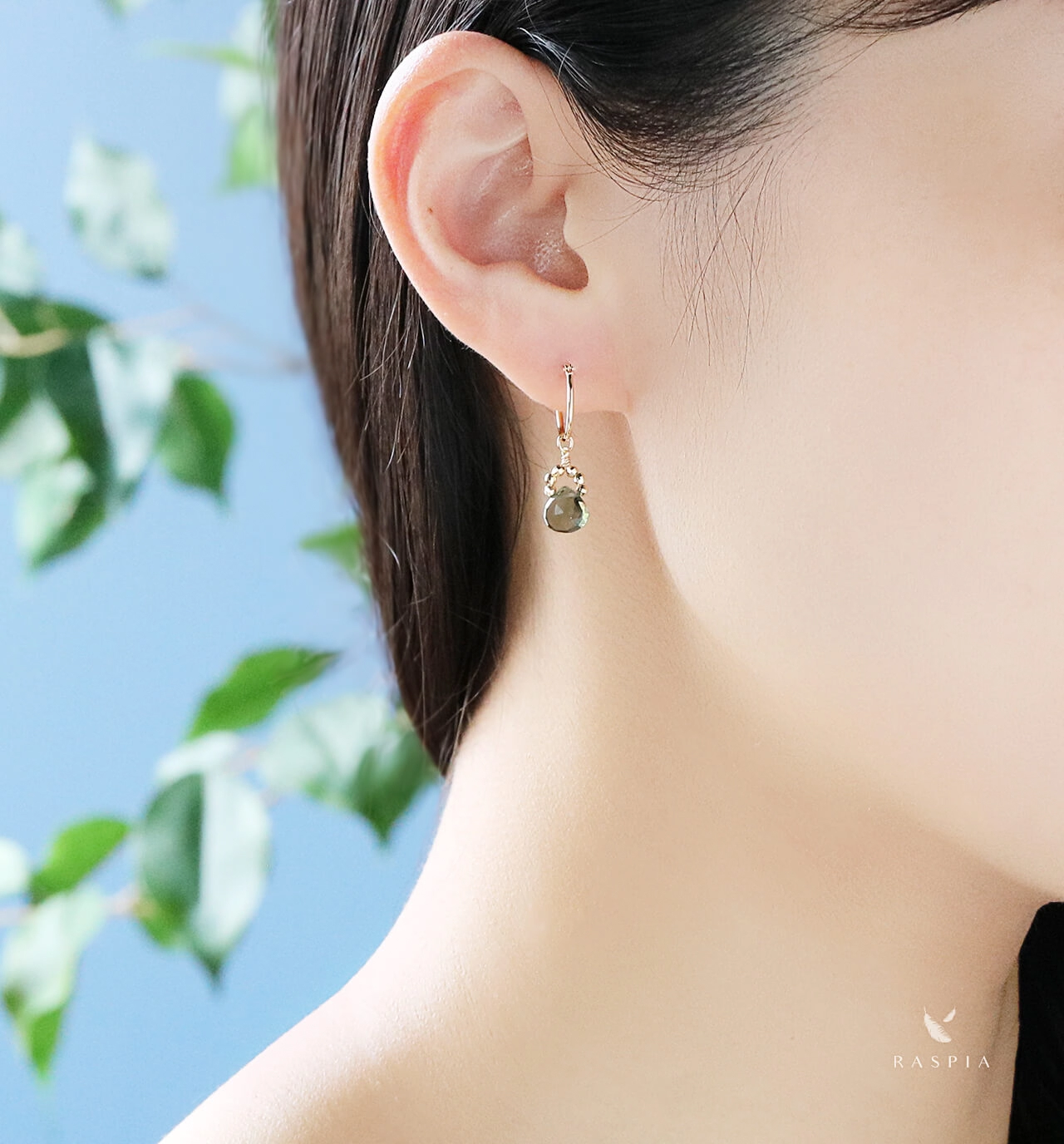 希少で価値が上がり続けているモルダバイトを使った数量限定のピアスです。宇宙の力を秘めた貴重な石モルダバイトのマロンカットを使用しています。