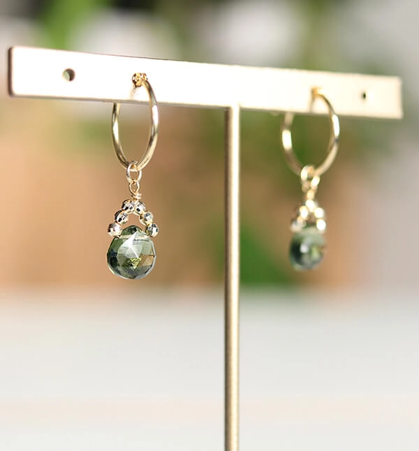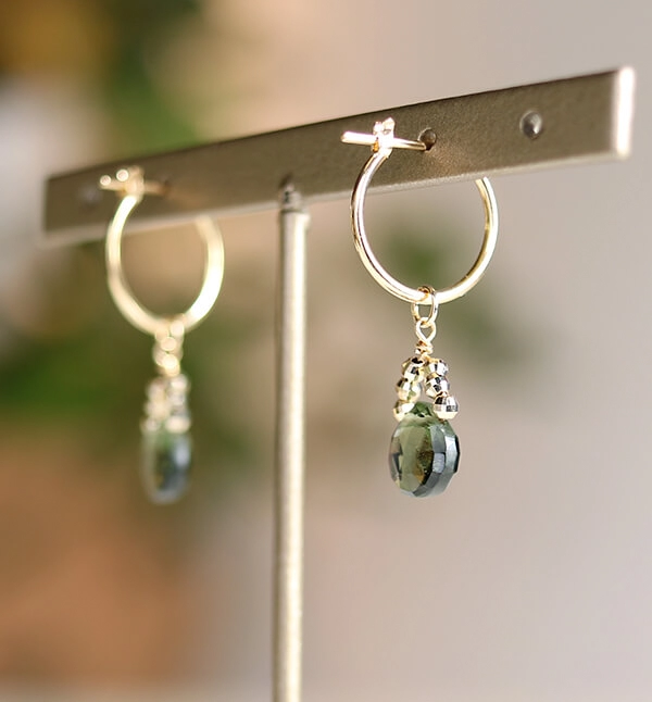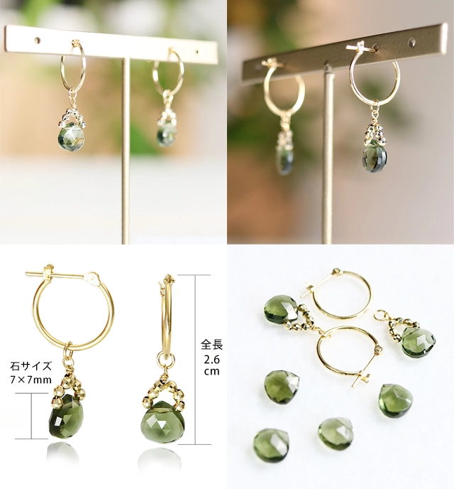| サイズ | 【ピアス】サイズ:直径 13mm×太さ1mm ポストの太さ 0.7mm【イヤリング】サイズ:直径10mm×太さ0.7mm【石】モルダバイト:約7mm×7mm【チャーム丸カン内径】約2mm | ||