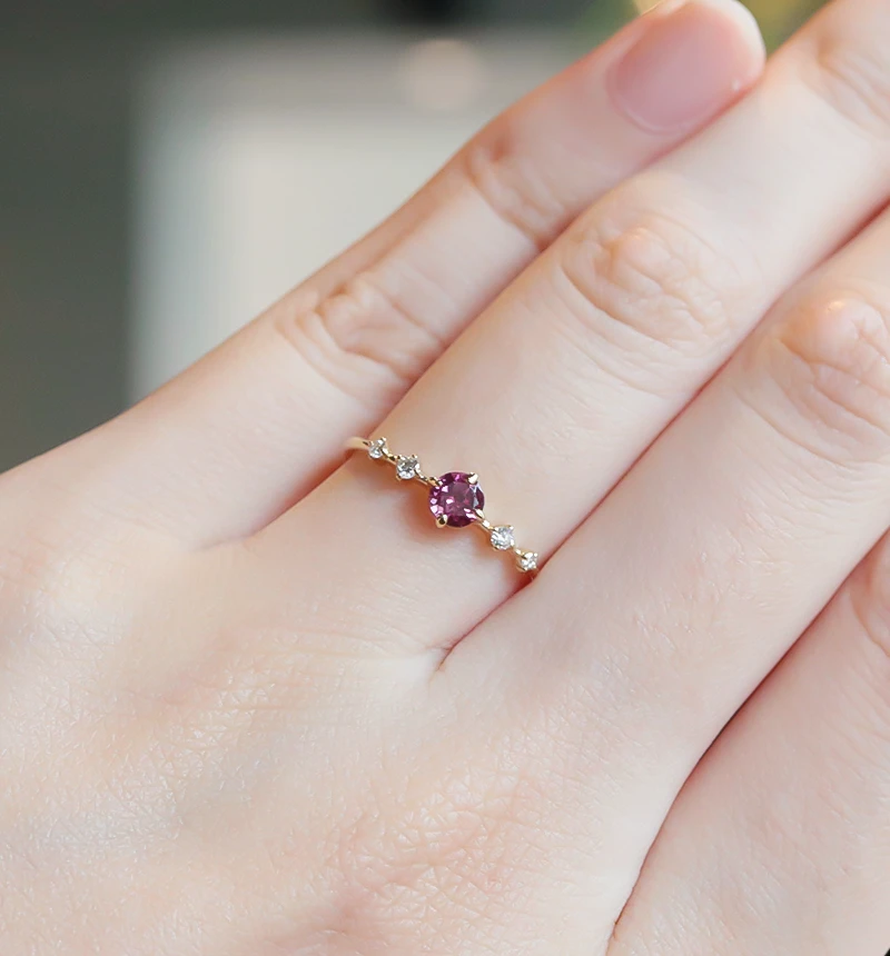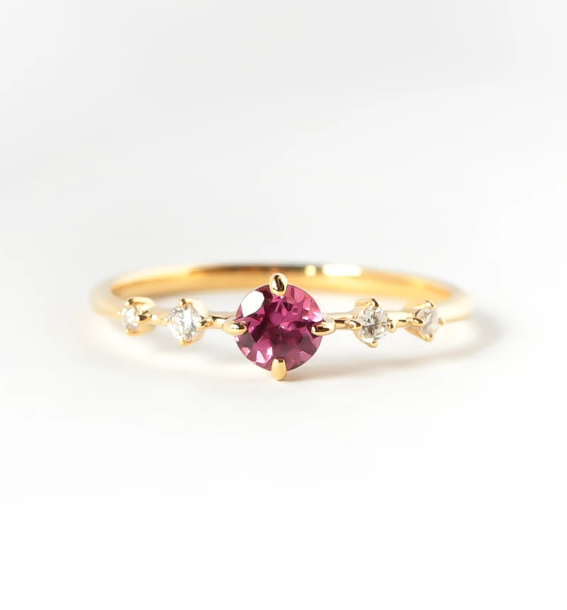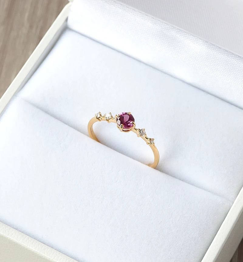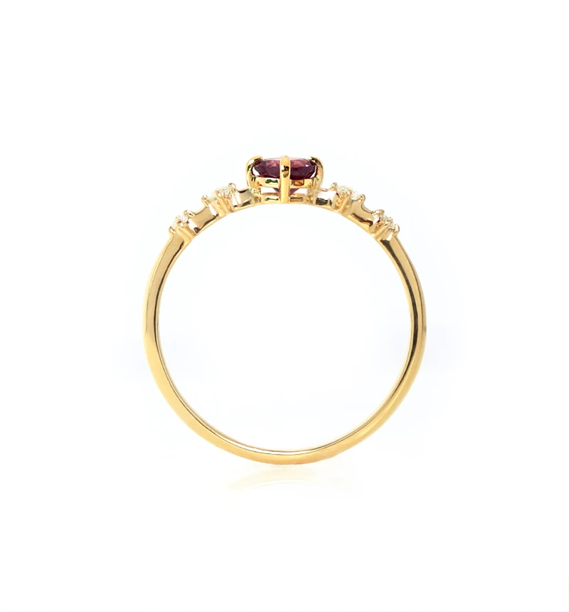 特有のレッドカラーが魅力的なラウンドカットのマラヤガーネットをメインに、4つのメレダイヤを配したK18リングです。ラウンドカットにより施されたカット面が光を反射し、キラキラと美しく輝きます。ガーネットは1月の誕生石です。