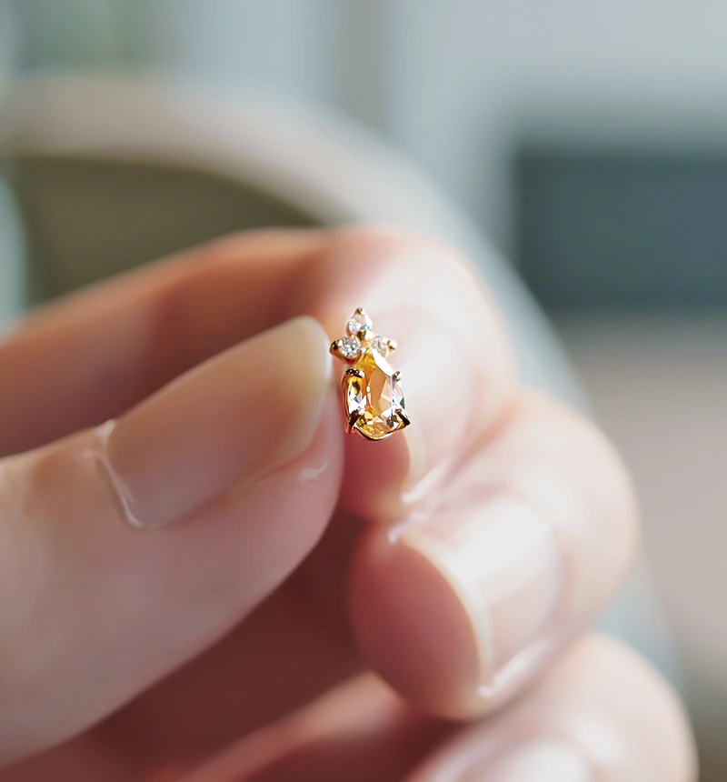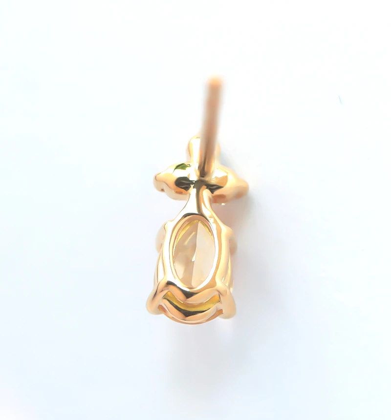 ピアスの金具はすべて18金でお作りしており、鮮やかな金色を長くお楽しみいただけます。石留めの爪はさりげなく繊細で、石の存在感を引き立てます。