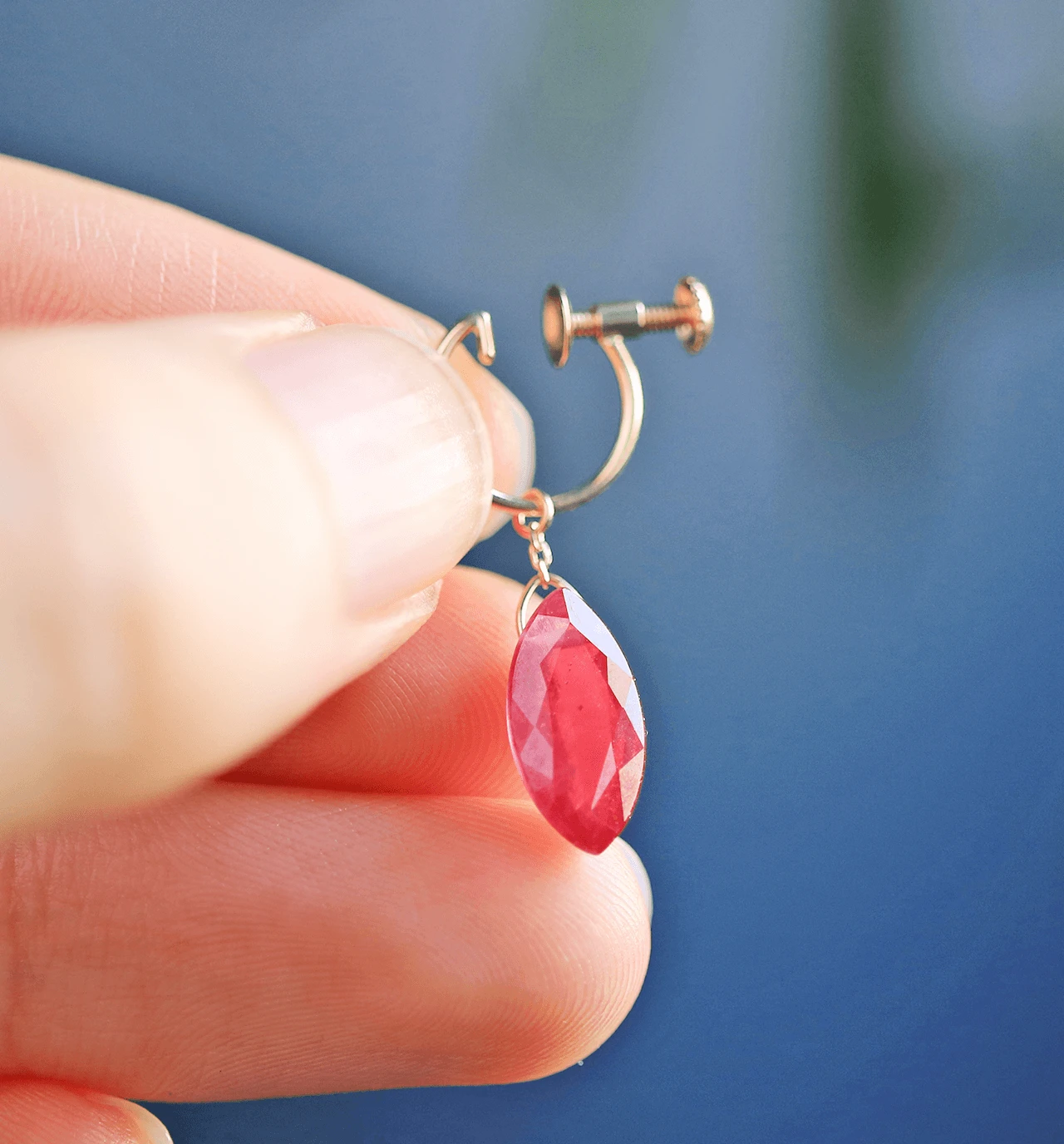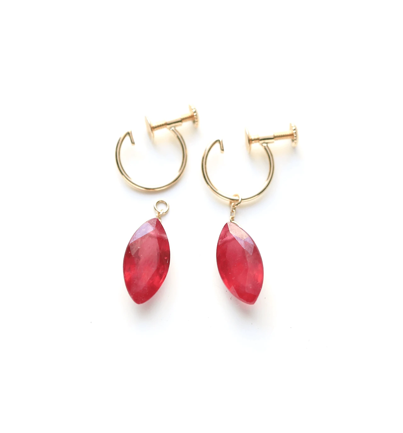 | サイズ | 【イヤリング】サイズ:直径10mm×太さ0.7mm【石】ルビー:縦 約10mm × 横 約5mm【チャーム丸カン内径】約1.4mm | ||