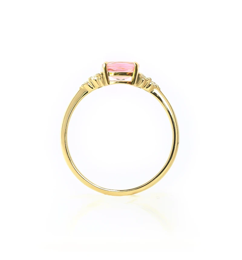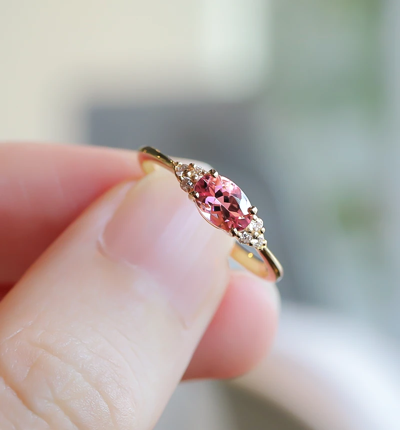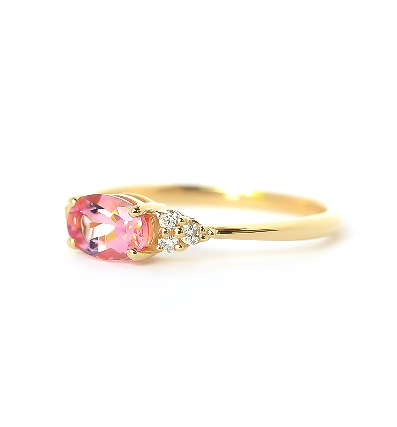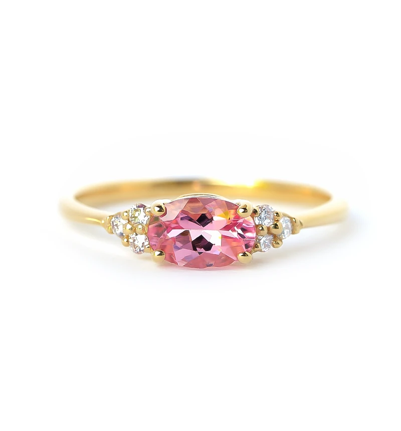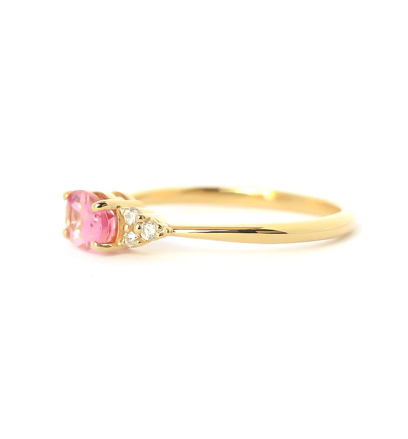 ピンクトルマリンのオーバルカットをメインに、6つのメレダイヤを左右にセットしたK18リングです。華やかなカラーが魅力のピンクトルマリンは、トルマリンのなかでも人気の宝石です。また10月の誕生石です。