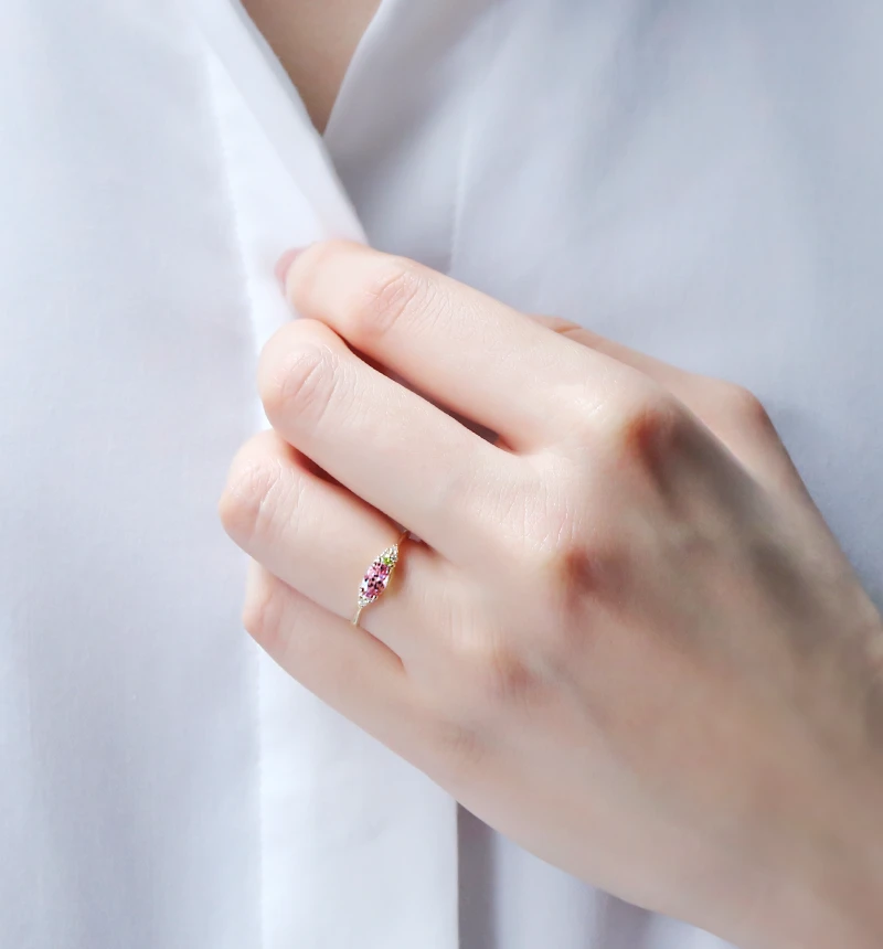 石が主役になる、そして鮮やかなカラーストーンの美しいきらめきが楽しめるリングになるように、細部までこだわり作り上げています。メイン石の左右に配置されたダイヤモンドがさらに気品とジュエリーの魅力を引き立たせます。指輪の重ね付けをしたり、Elloシリーズのネックレスと合わせたりと様々なコーディネートでお楽しみください。