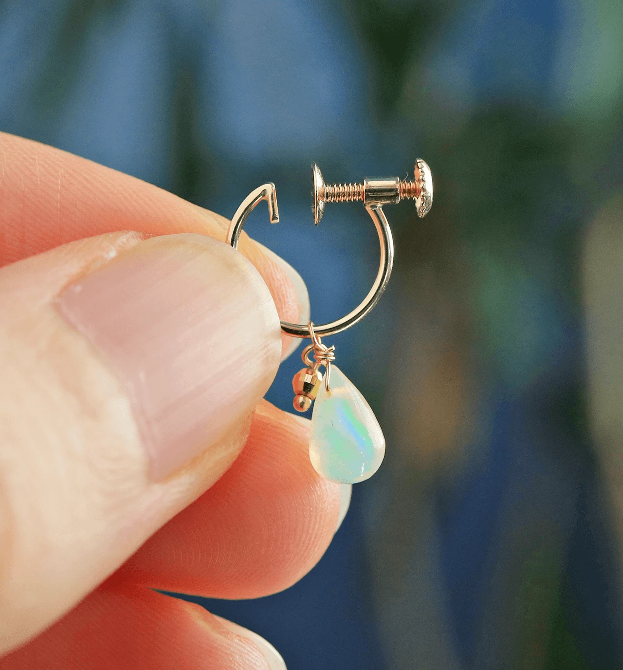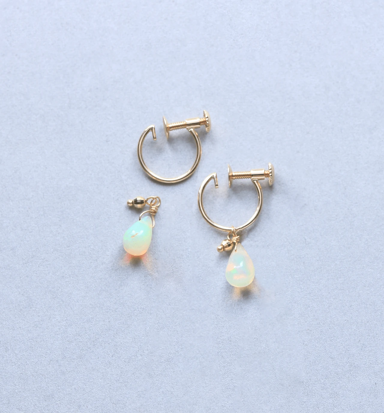 つるんとした透き通るホワイトに色とりどりの光を見せるオパールを使用したイヤリング。シンプルな中にのぞく可愛さがいつもと違う一面を演出してくれます。