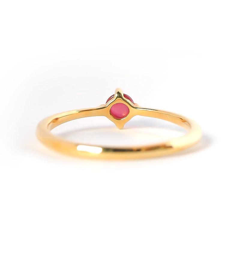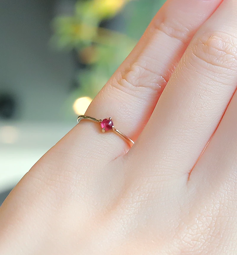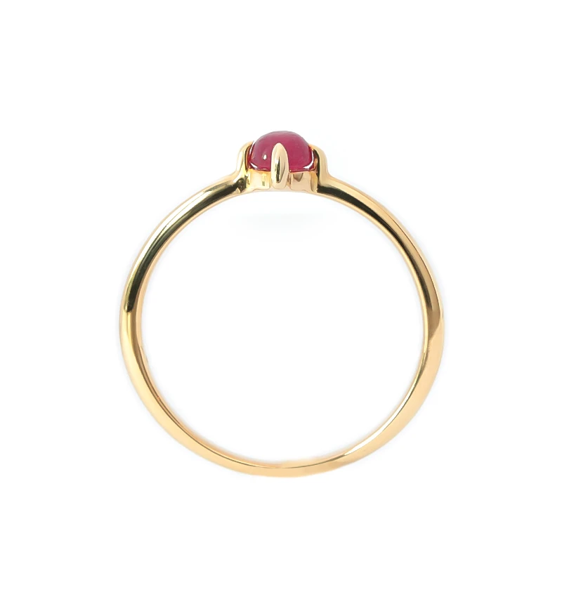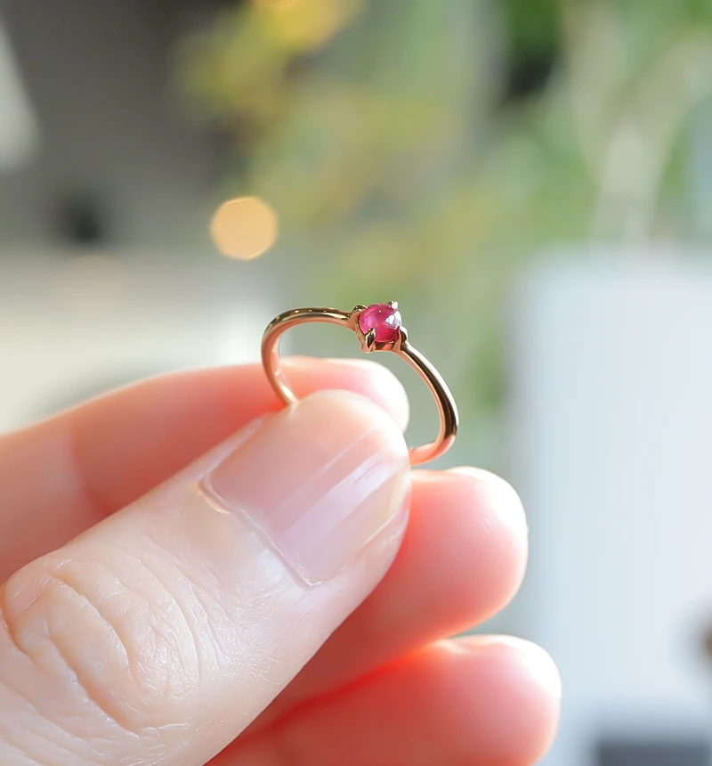燃え盛る炎のように情熱的に輝くカボションカットのルビーを使用したK10ピンキーリングです。カボションカットはカット面がなく、丸みを帯びており、宝石本来の質感を味わうことができます。