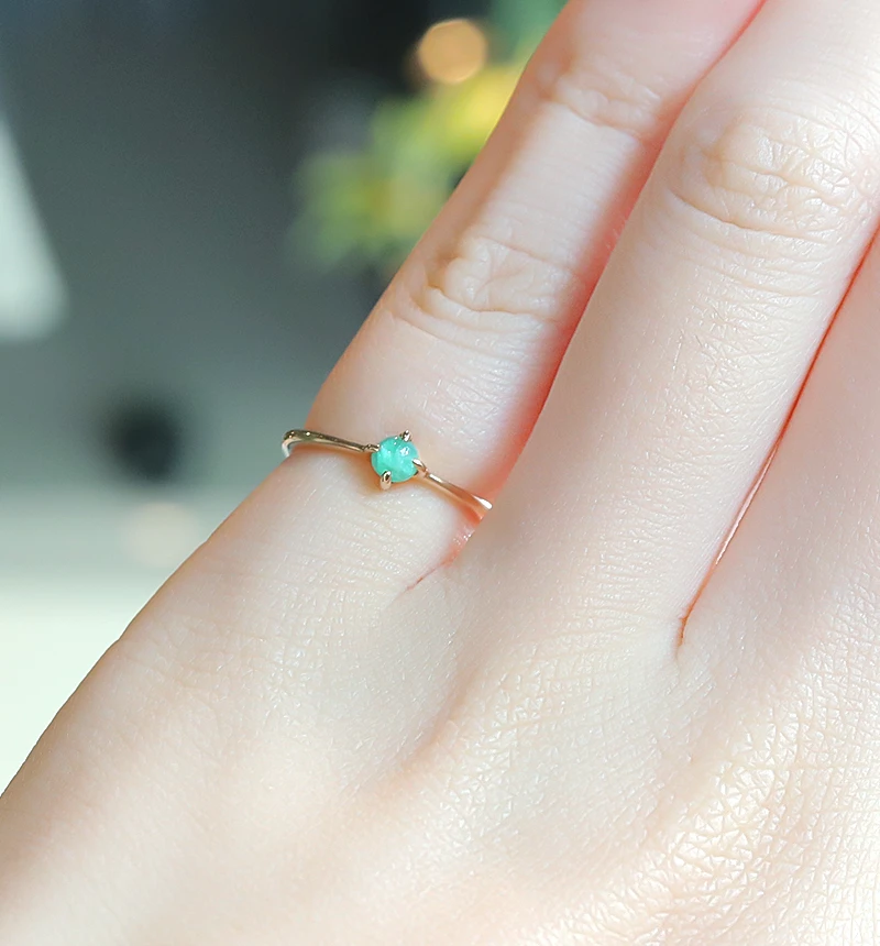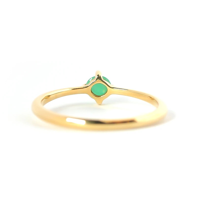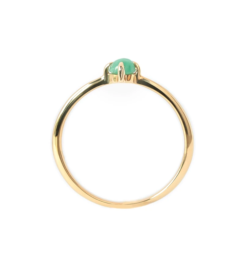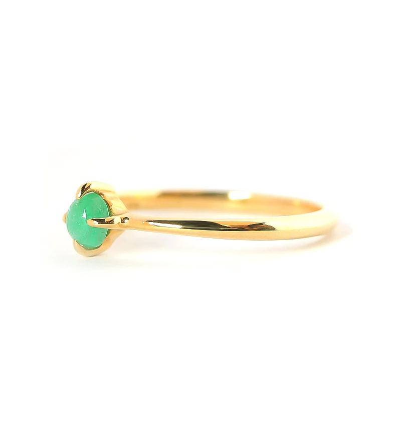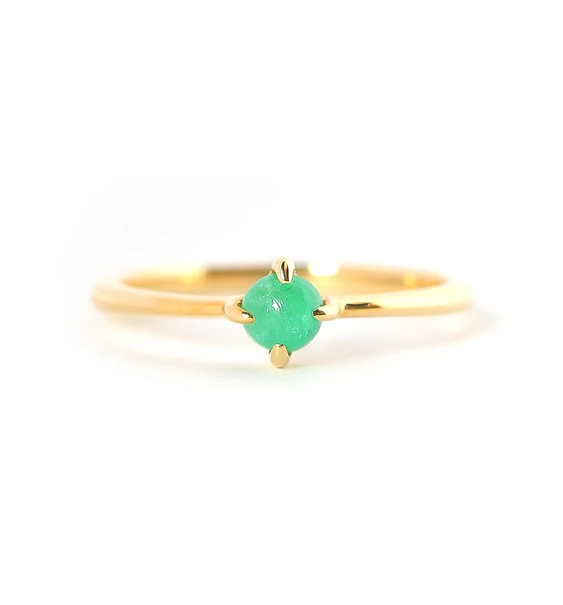くすみのない鮮やかな緑色が美しいカボションカットのエメラルドを使用したK10ピンキーリングです。カボションカットはカット面がなく、丸みを帯びており、宝石本来の質感を味わうことができます。