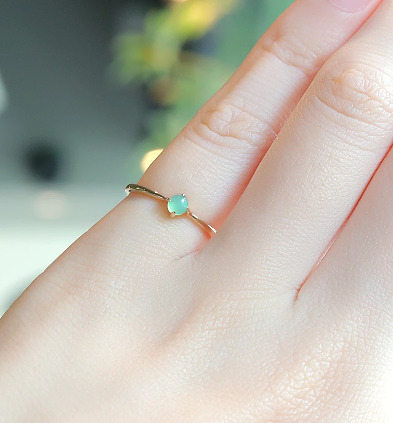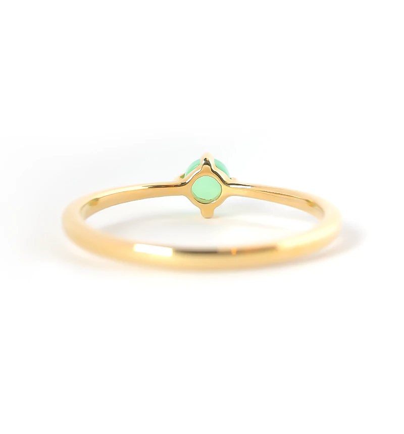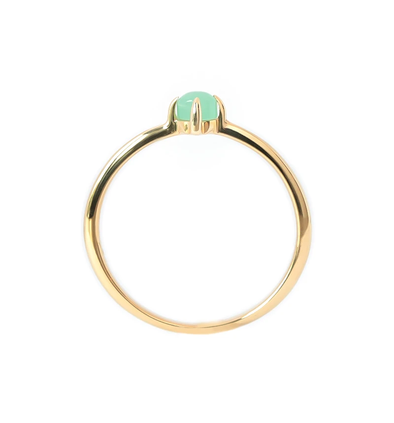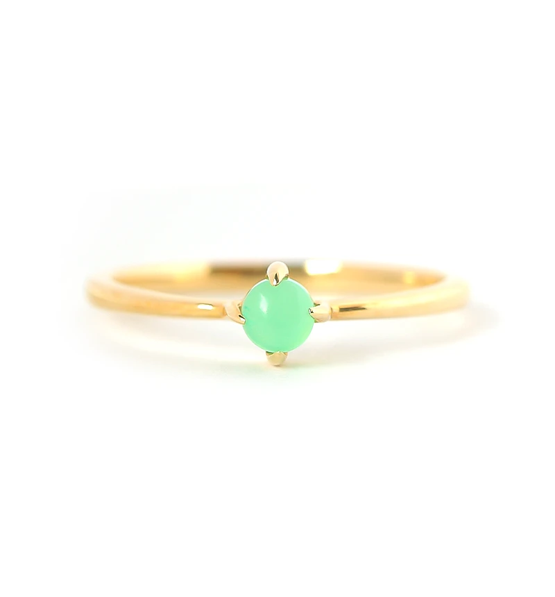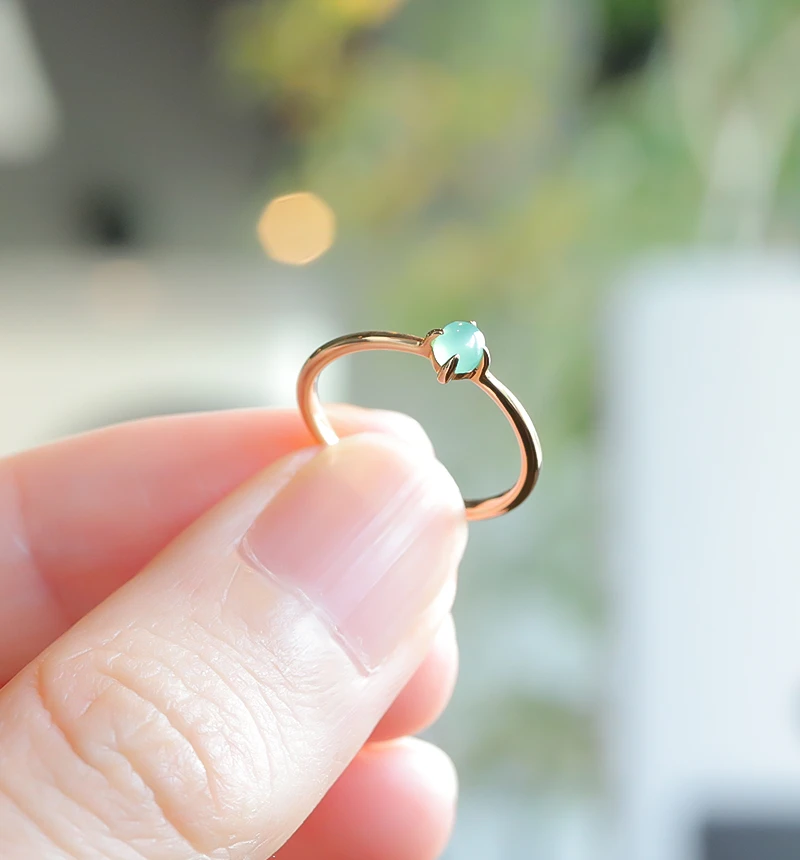 発色が良く、小粒ながら存在感抜群のカボションカットのクリソプレーズを使用したK10ピンキーリングです。カボションカットはカット面がなく、丸みを帯びており、宝石本来の質感を味わうことができます。