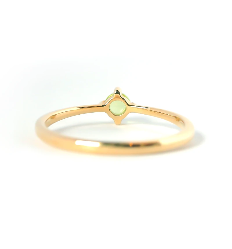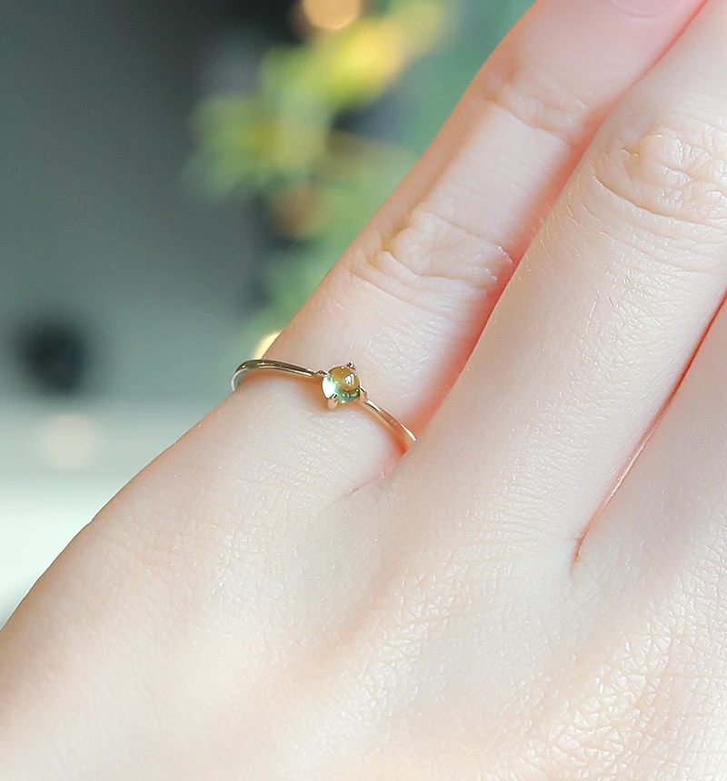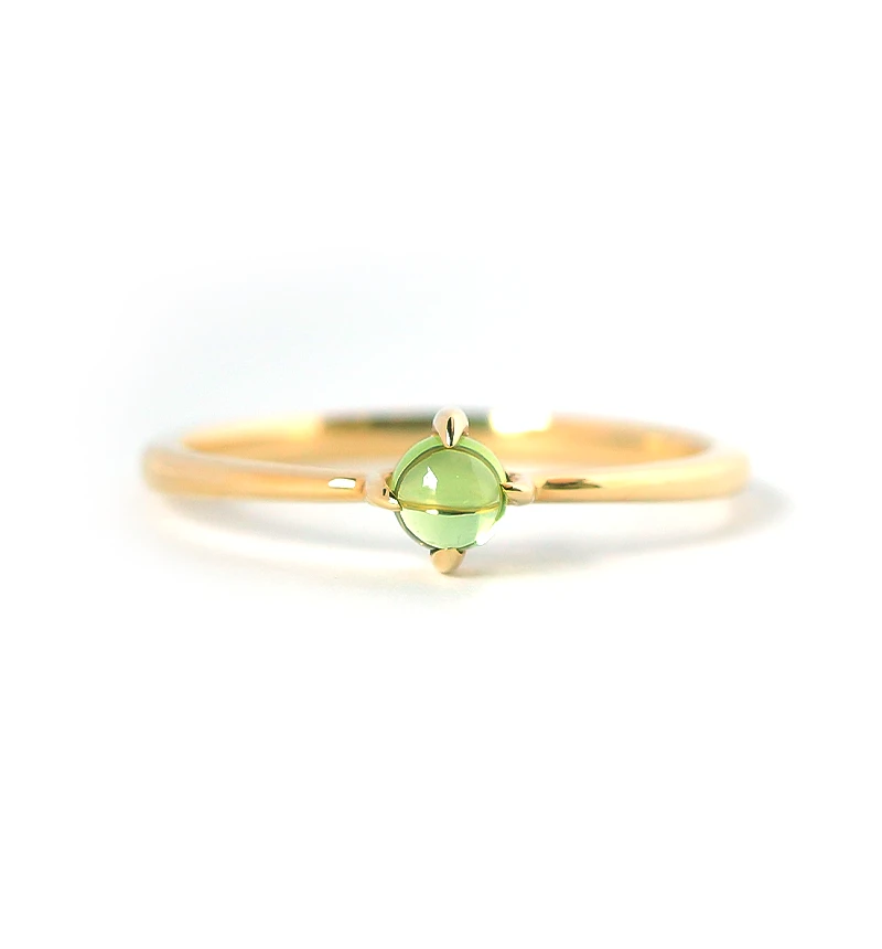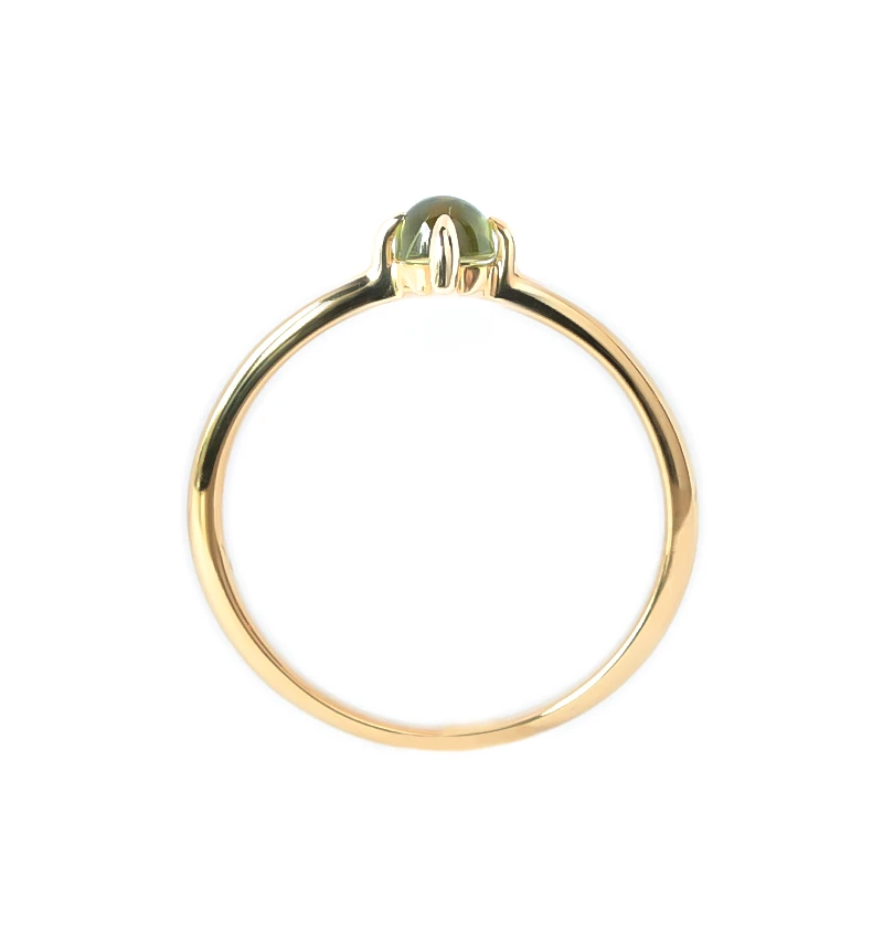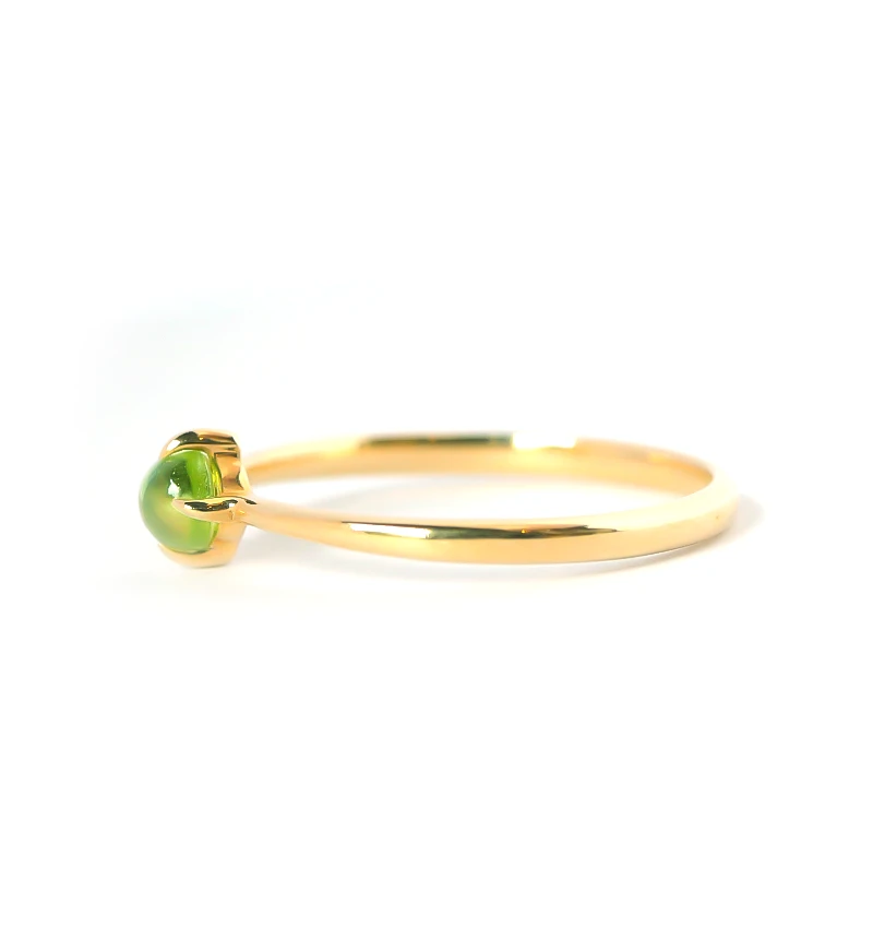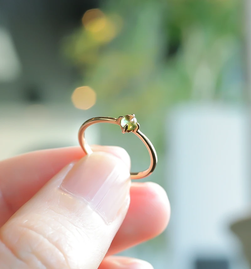 オリーブグリーンが美しいカボションカットのペリドットを使用したK10ピンキーリングです。カボションカットはカット面がなく、丸みを帯びており、宝石本来の質感を味わうことができます。