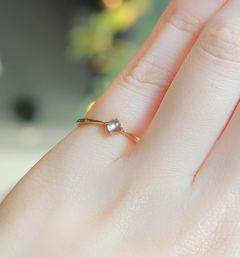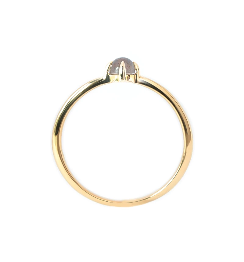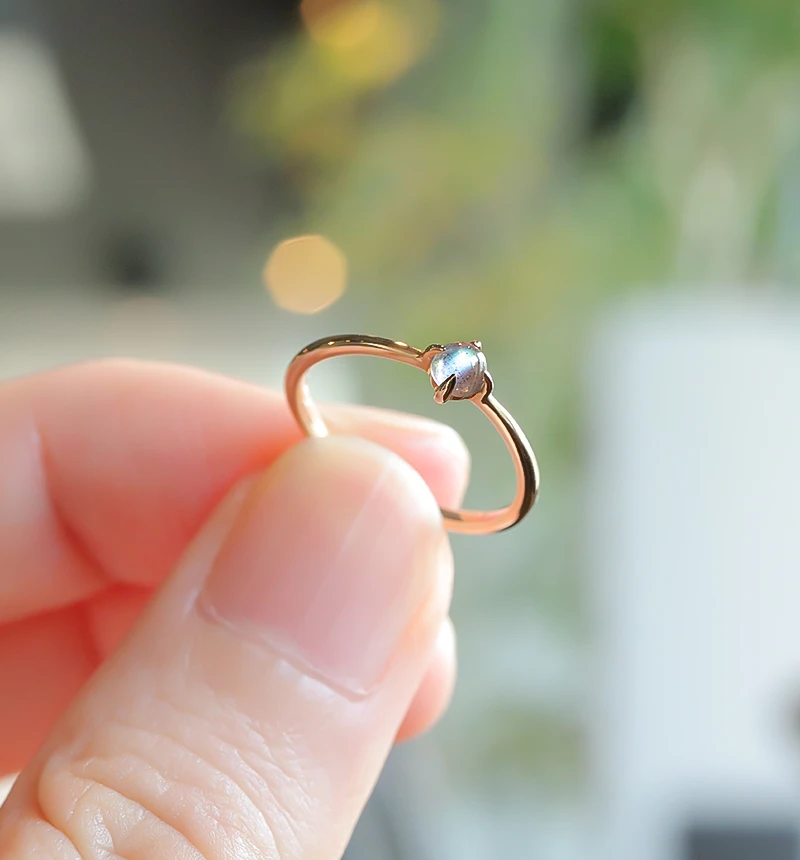 シラーと呼ばれる特有の輝きが美しいカボションカットのラブラドライトを使用したK10ピンキーリングです。カボションカットはカット面がなく、丸みを帯びており、宝石本来の質感を味わうことができます。