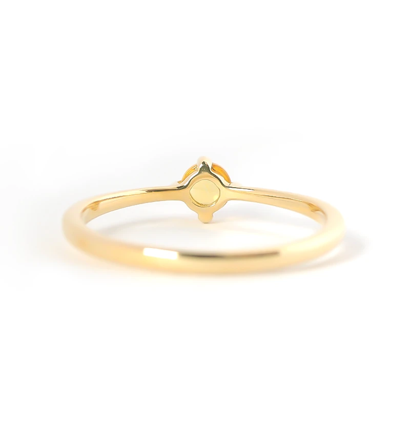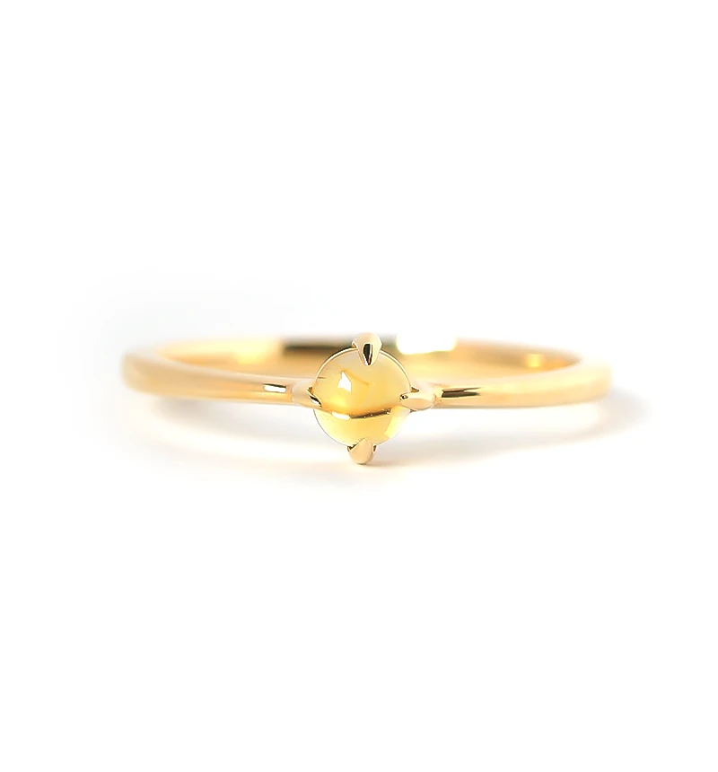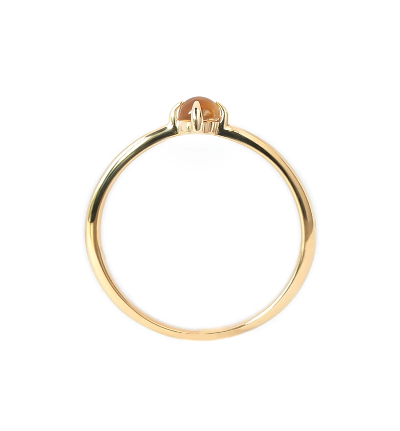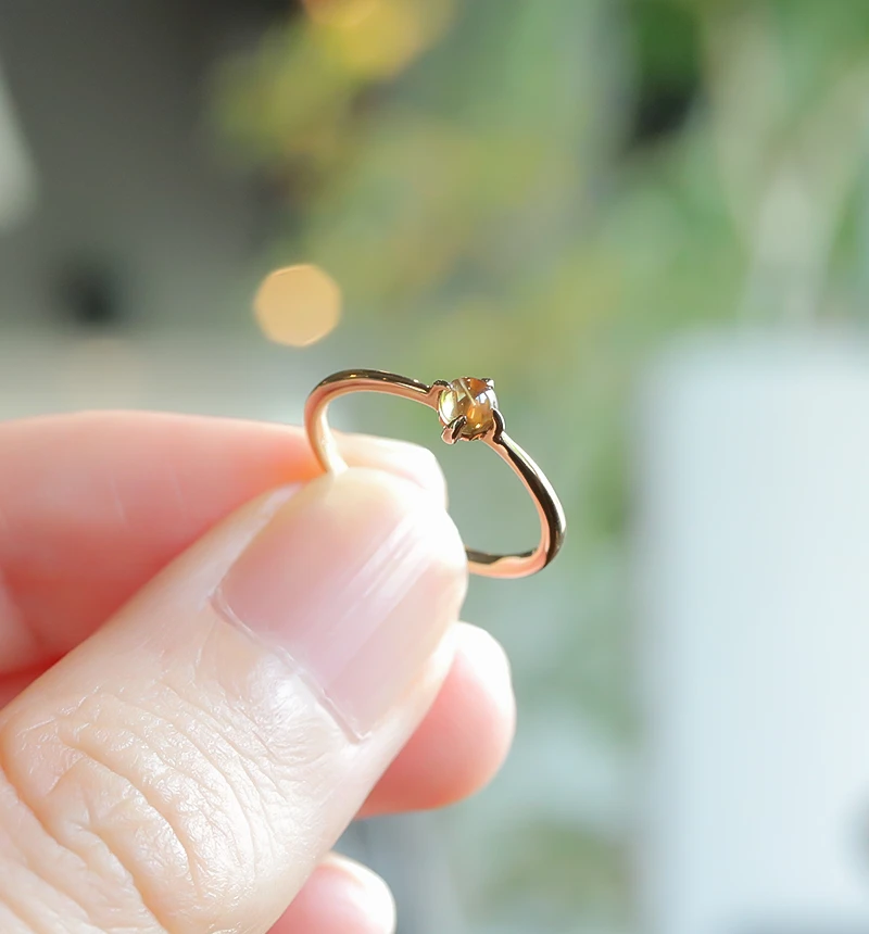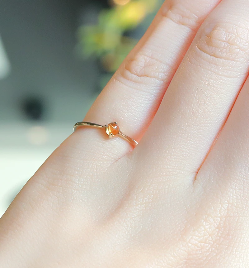 黄金の光をまとったような色味と表面の光沢が印象的な、カボションカットのシトリンを使用したK10ピンキーリングです。カボションカットはカット面がなく、丸みを帯びており、宝石本来の質感を味わうことができます。
