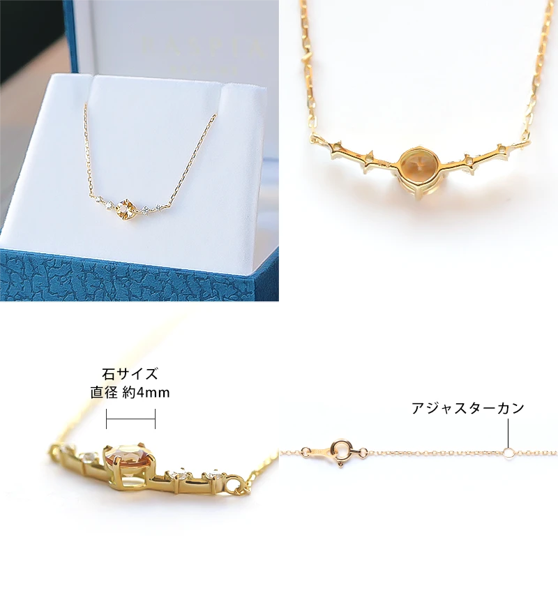 ネックレストップの石留めは、極限まで小さくさり気ない作りにこだわりました。小さいながらもしっかりと石を支え、宝石の存在感を引き立てます。 金具はすべて18金で、職人が細部まで丁寧に磨きあげました。鮮やかなイエローゴールドの輝きを長くお楽しみいただけます。
