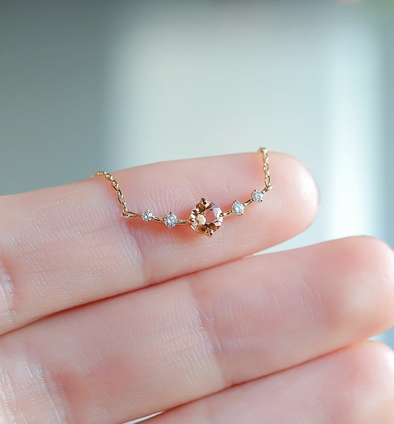 石が主役になる、そして鮮やかなカラーストーンの美しいきらめきが楽しめるネックレスになるように、細部までこだわり作り上げています。小さく繊細でありながら胸元で確かな存在感を発揮します。