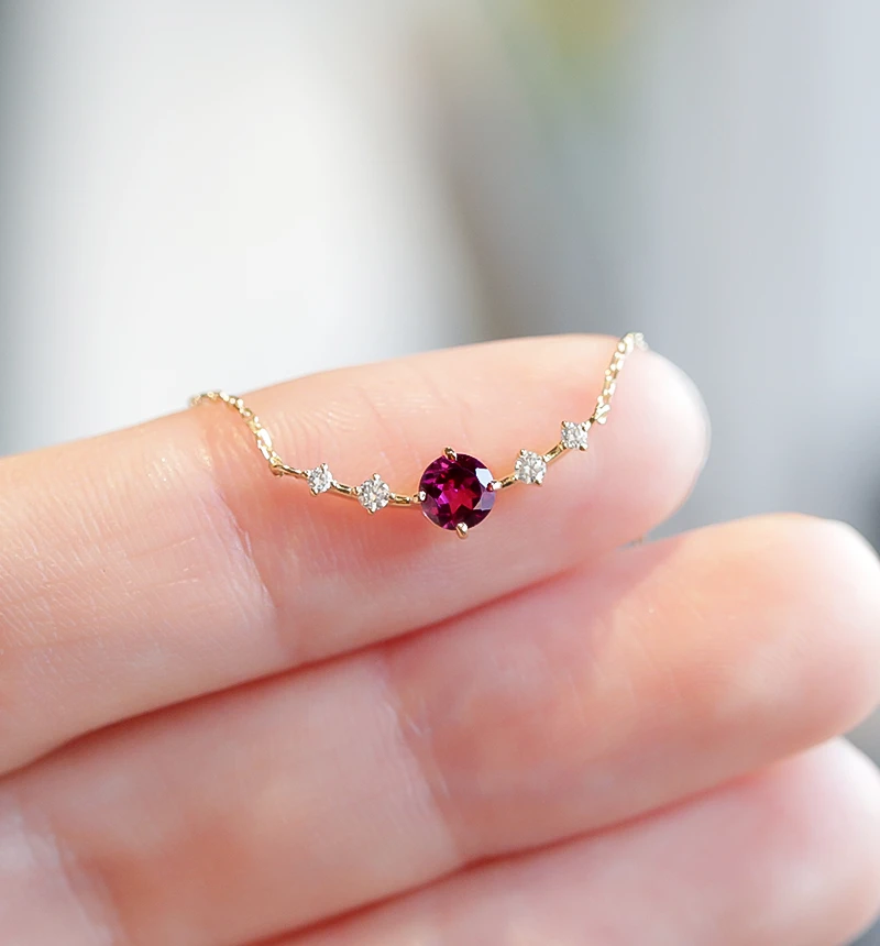 ロードライトガーネットのラウンドカットをメインに、4つのメレダイヤを配したK18ネックレスです。