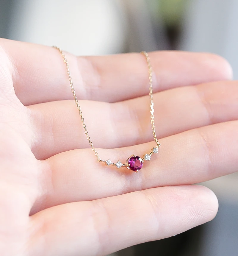 カシスや赤ワインのような深い色合いを最大限に引き立てるロードライトガーネットは、2種類のガーネットの成分が混ざりあって生まれた赤紫色のガーネットです。ネックレストップの石留めは、極限まで小さくさり気ない作りにこだわりました。小さいながらもしっかりと石を支え、宝石の存在感を引き立てます。 金具はすべて18金で、職人が細部まで丁寧に磨きあげました。鮮やかなイエローゴールドの輝きを長くお楽しみいただけます。