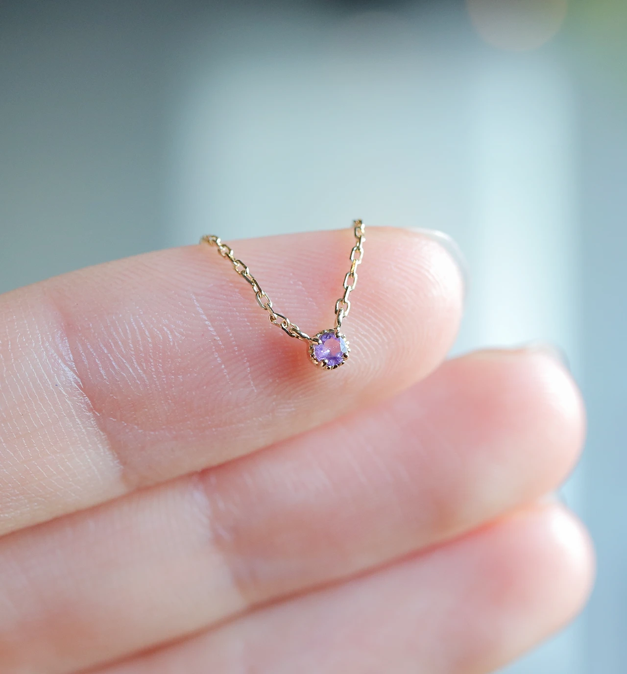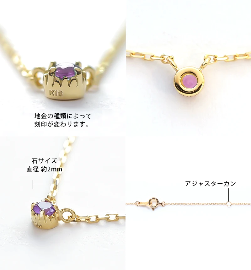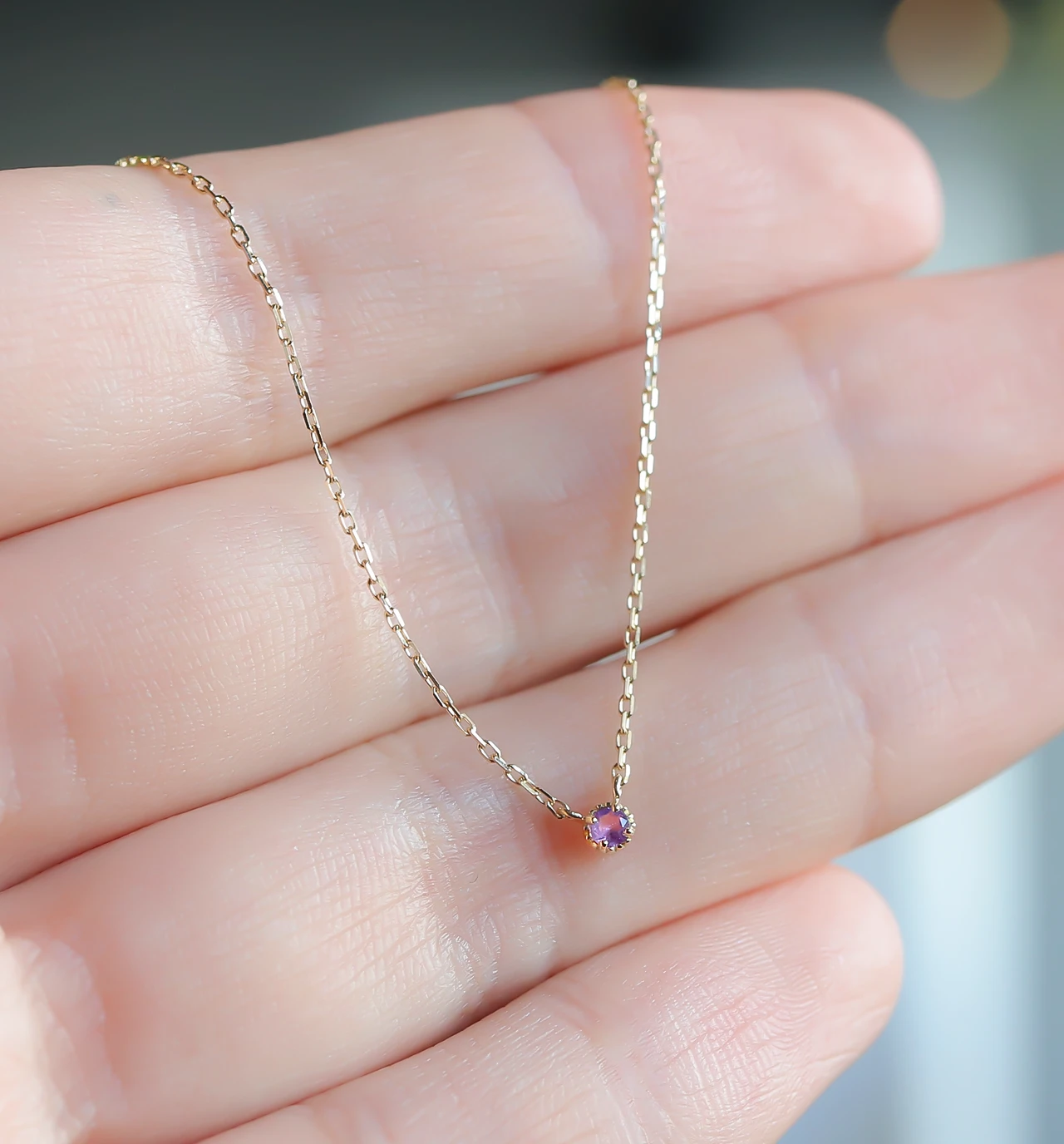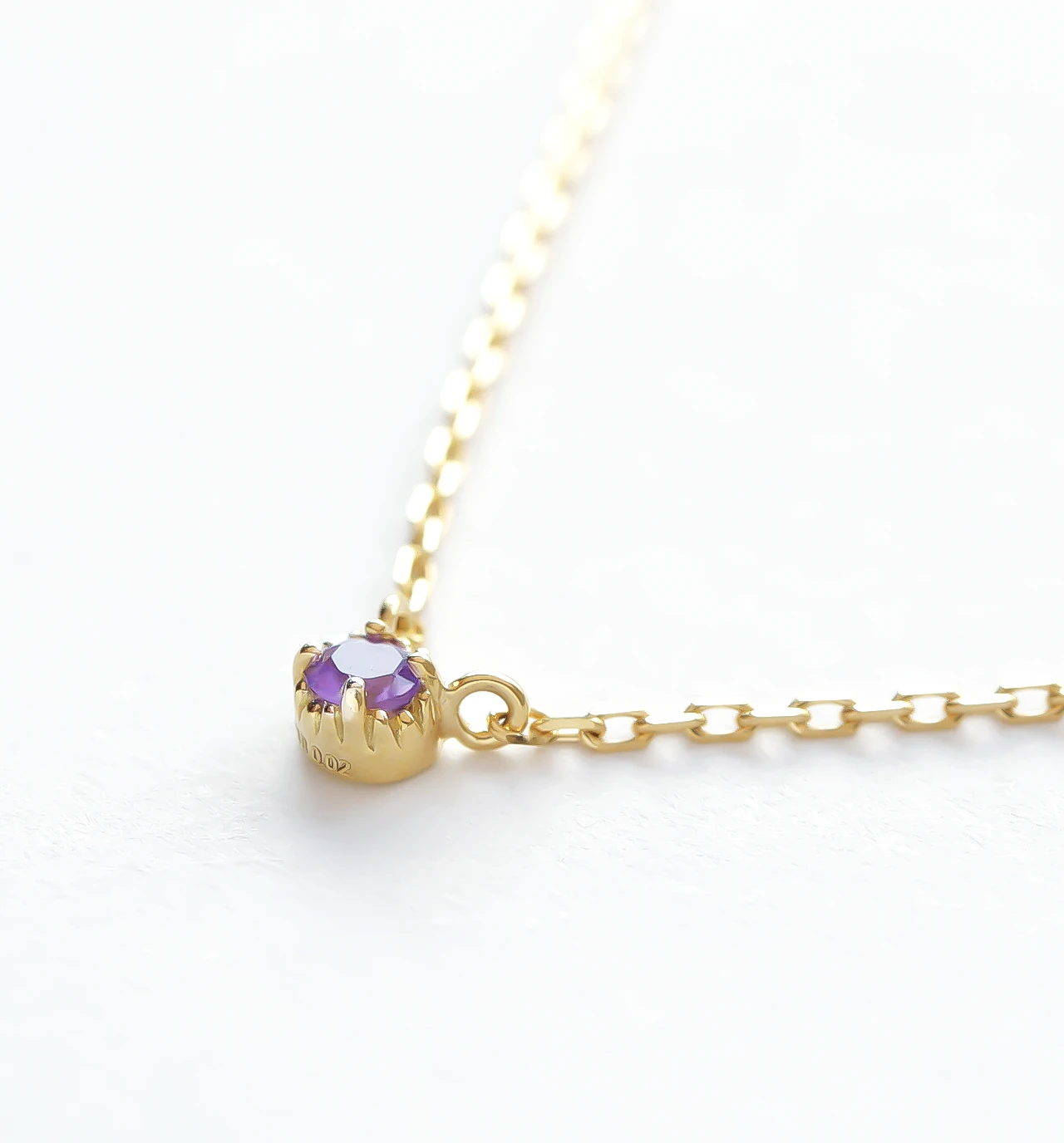 鮮やかなパープルカラーが美しい、アメジストを使用したシンプルな一粒ネックレスです。アメジストは数多い宝石の中でも唯一無二の魅力的な色合いをもち、日本では昔から紫が高貴な色とされていたたこともあり、大変人気の高い宝石です。