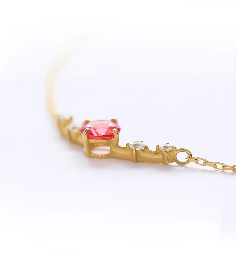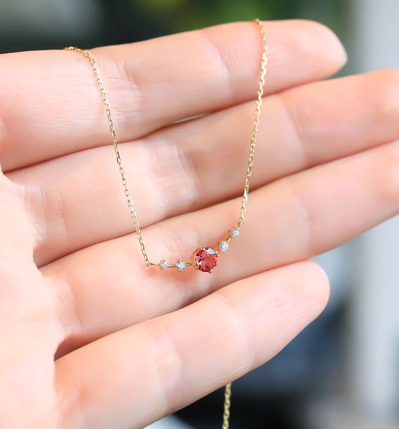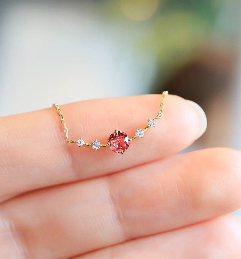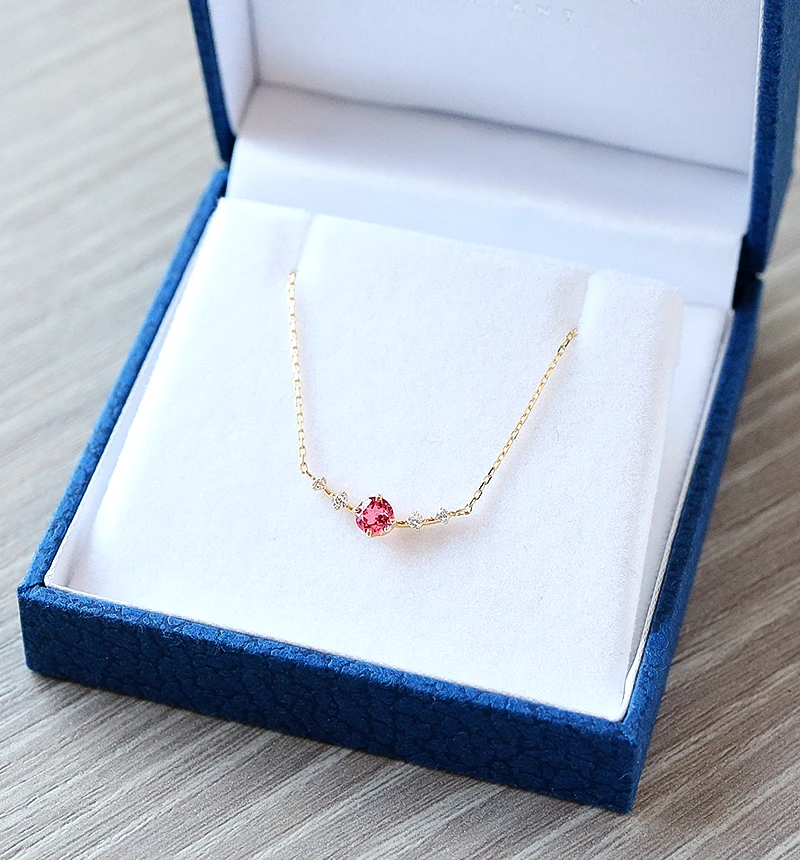 ピンクスピネルのラウンドカットをメインに、4つのメレダイヤを配したK18ネックレスです。