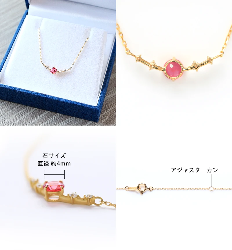 石が主役になる、そして鮮やかなカラーストーンの美しいきらめきが楽しめるネックレスになるように、細部までこだわり作り上げています。小さく繊細でありながら胸元で確かな存在感を発揮します。